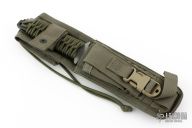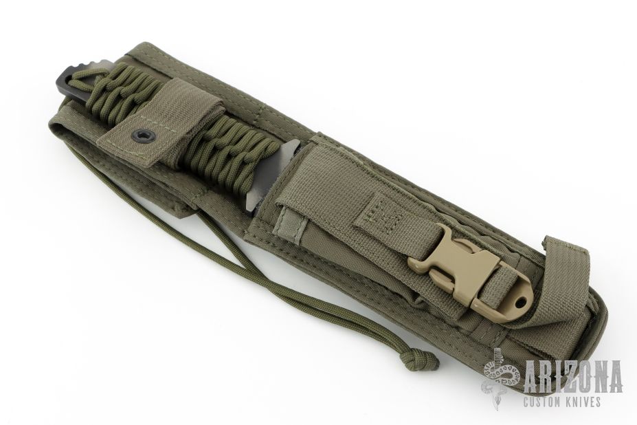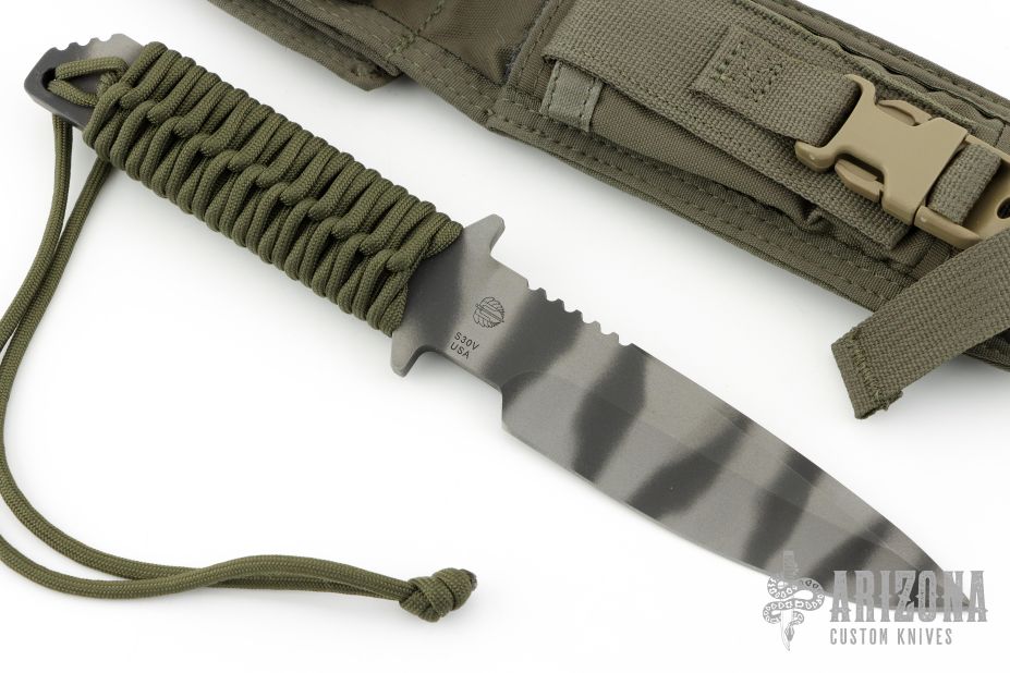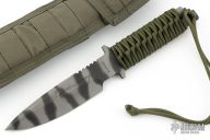 Special edition, Chuck Mawhinney "Sniper" fixed blade from Strider Knives. Chuck Mawhinney served in the Vietnam War and set a record number of confirmed kills for a USMC sniper. The CPM S30V blade has flat ground edge and sharpened top edge. The tiger striped blade is marked with a "Chuck Mawhinney" signature. The front tang is marked "STRIDER SNIPER" and the back has the logo. Full tang construction makes this knife very solid. Handle is paracord wrapped (green) and features jimping on the blade spine for thumb. Includes heavy duty SOE Brand Nylon sheath system with felt bonded Kydex liner & accessory pouch. Excellent condition.