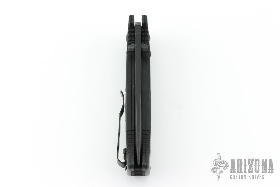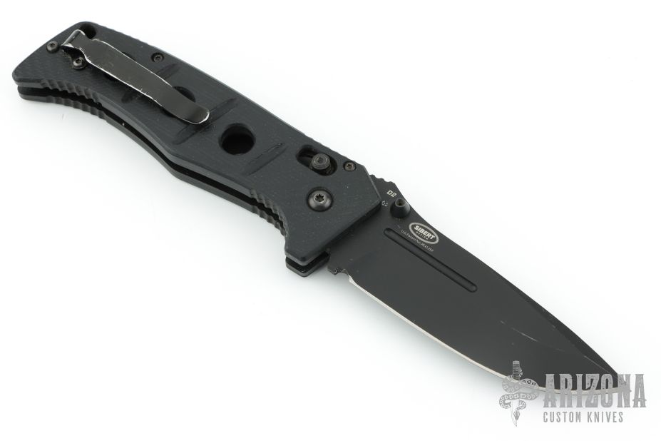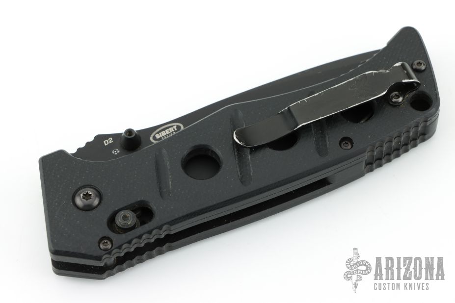 This Siebert designed 275 Adamas Axis Lock has a black coated D2 stainless steel drop point blade with fullers and notched thumb rest. Handle is black G10 over black stainless steel liners, black G10 spacer, reversible tip up black stainless steel clip. Comes with original box, papers, and nylon belt sheath. Has some light scuffs and scratches, great condition otherwise.