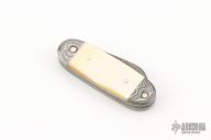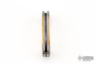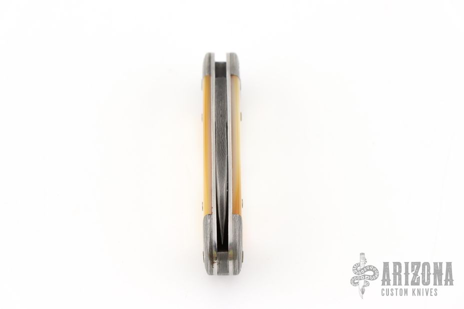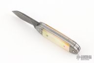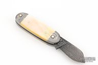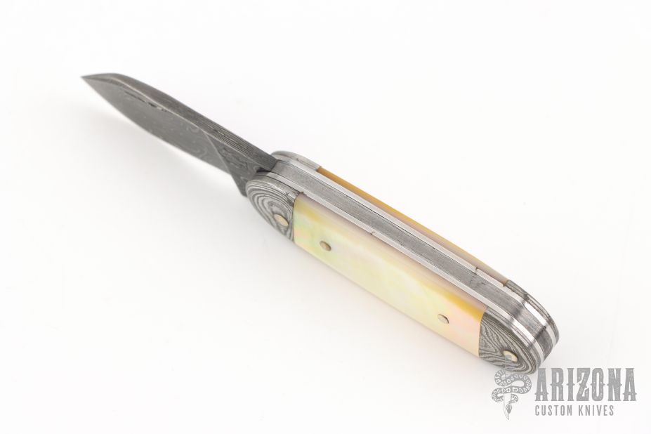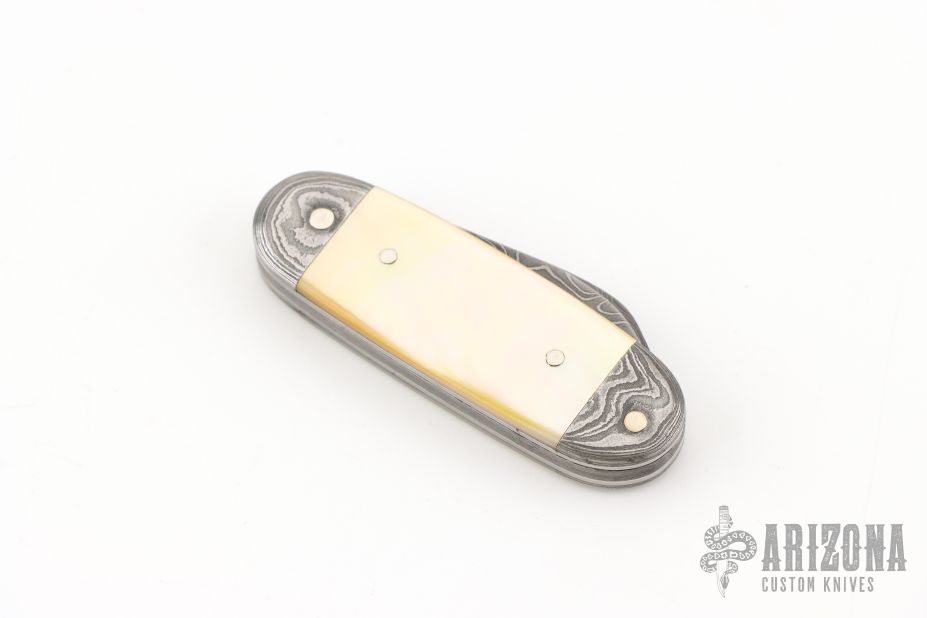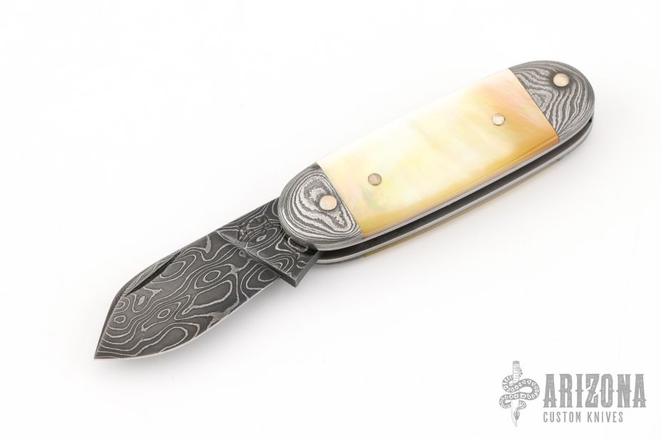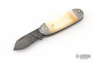 This Mini Sunfish slipjoint by Master Smith Don Hanson III features a Damascus (1095/15n20) blade with nail nick. The handle Damascus (1095/203E) bolsters, front and rear, gold lip pearl covers, polished steel liners, and Damascus spring. Nice blade seating. The action is a bit stiff. Comes with a soft pouch and Bill's case. Has a little rusting on the spring and bolsters. Excellent condition otherwise.