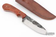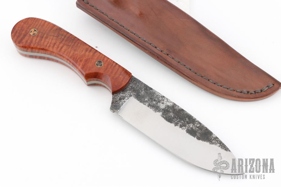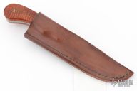 This Hunter by Renner Knives features a drop point blade with forge finished flats, satin bevels, .178" blade thickness and 1.409" blade depth, full tang construction. The handle has maple covers with mosaic pins. Comes with a brown leather sheath. Has some light scratches, otherwise excellent condition.