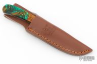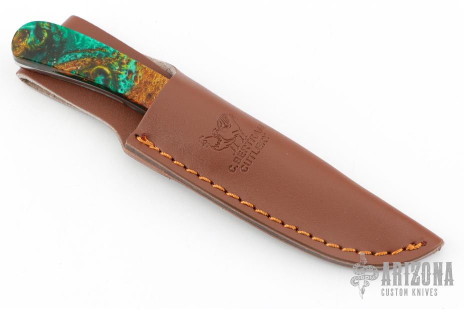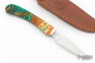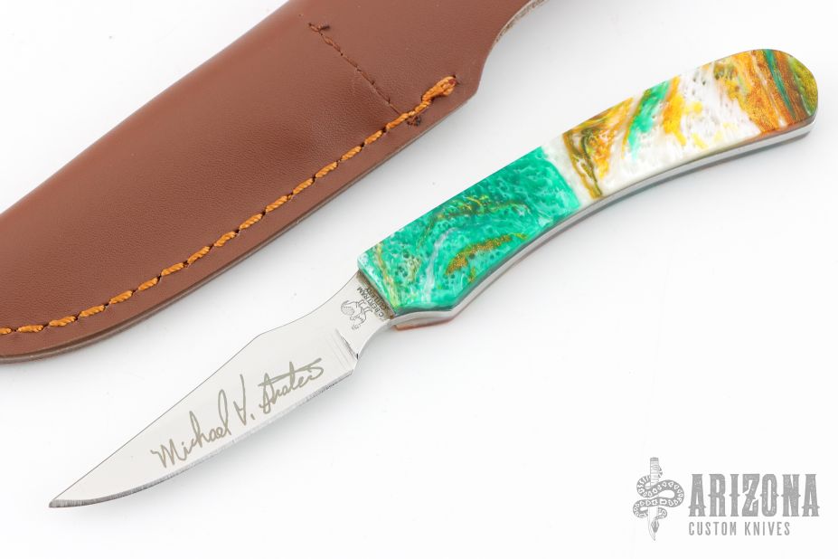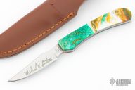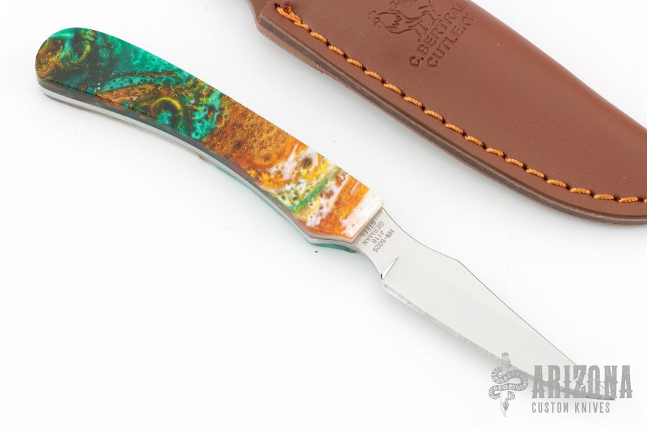 This fixed blade by Hen & Rooster was customized by Painted Pony Designs. The knife features a mirror polished blade with .110" blade stock and .613" blade depth, full tang construction. The handle has acrylic covers. Comes with original leather belt sheath and box/papers. Excellent condition.