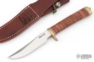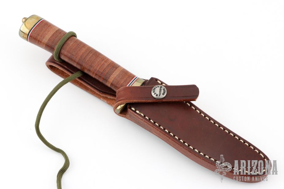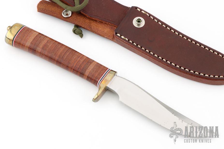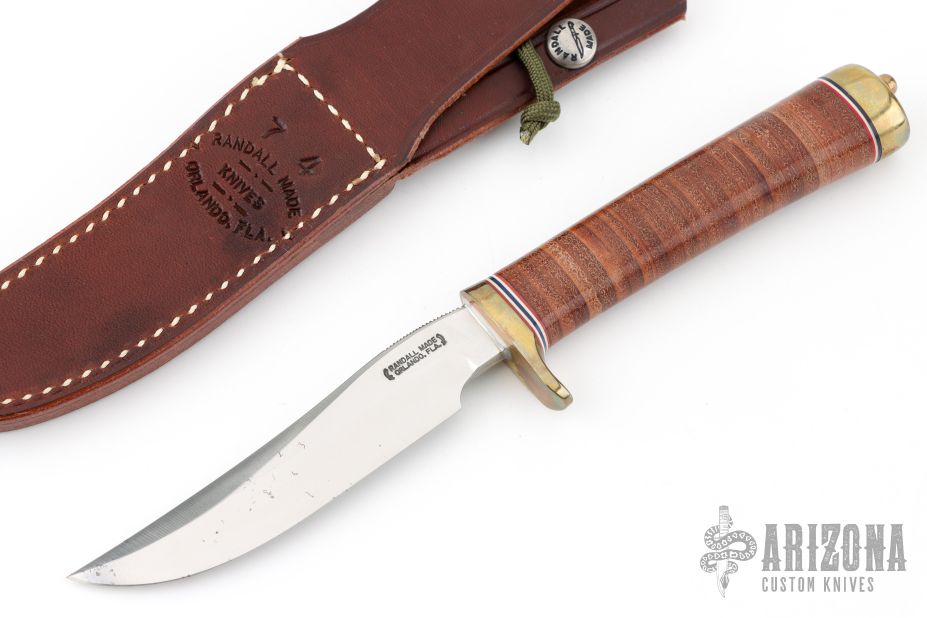 This Model 7-4.5 by Randall Made Knives features a satin finished blade with false top edge and notched thumbrest, .163" blade stock and .947" blade depth, hidden tang construction. The handle has a brass guard, stacked leather grip and red/white/blue spacers, brass butt. Knife comes with a brown leather sheath and original paper wrapping. Has some small oxidation spots on the blade, otherwise good condition.