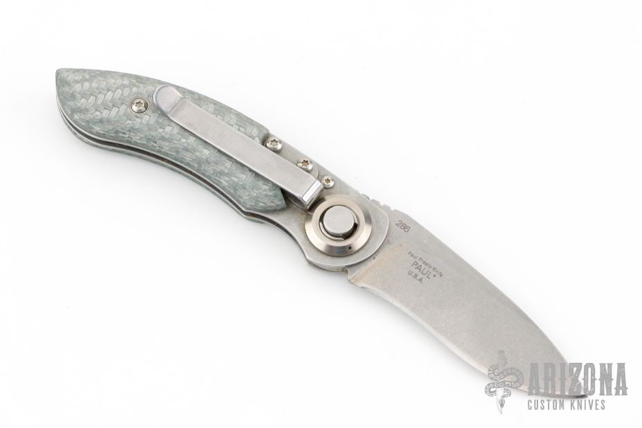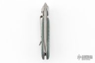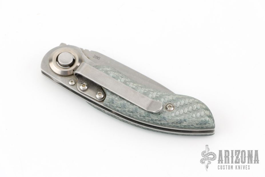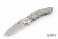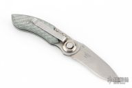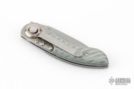 This Gentleman's folder by Lone Wolf Knives has a tumble finished stainless steel clip point blade with notched thumb rest. Handle is silver twill over tumble finish stainless steel frame. Stainless steel tip down clip. #286. Has a small spot on the blade, otherwise excellent condition.