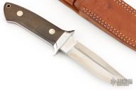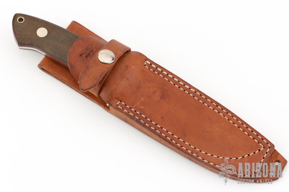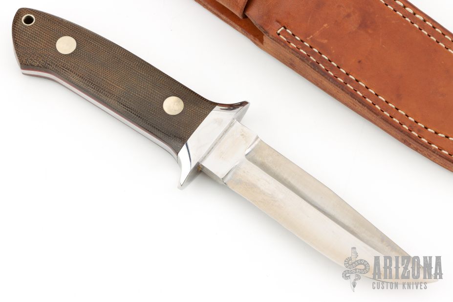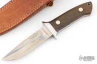 This Chute Knife by GL Wall features a satin finished blade with a false top edge, .280" blade stock and 1.091" blade depth, full tapered tang construction. The handle has a stainless steel double guard, green canvas micarta scales. Comes with a brown leather sheath. Excellent condition.