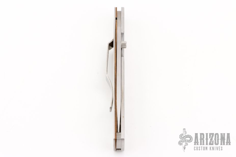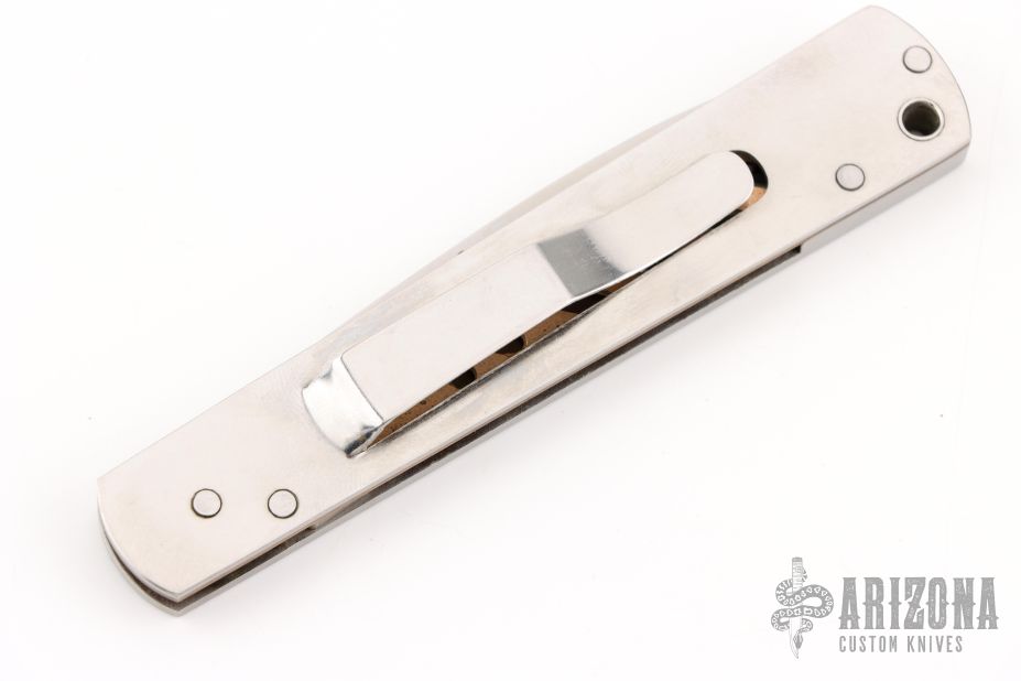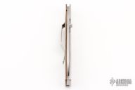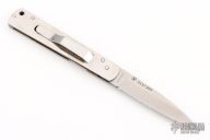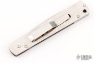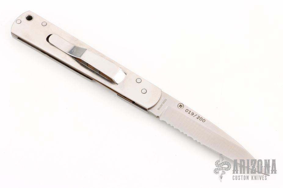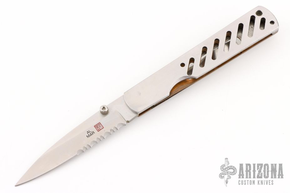 This large liner lock from Al Mar Knives has a partially serrated drop point satin finish blade with single thumb stud. The handle has a stainless steel liner and frame. Has scuffs/scratches otherwise the knife is in excellent condition.