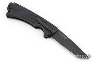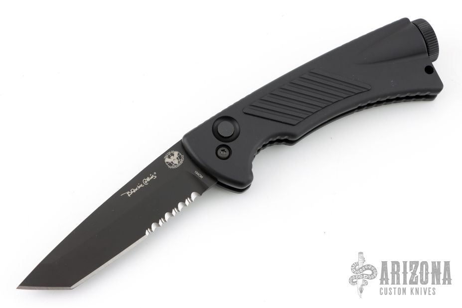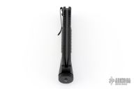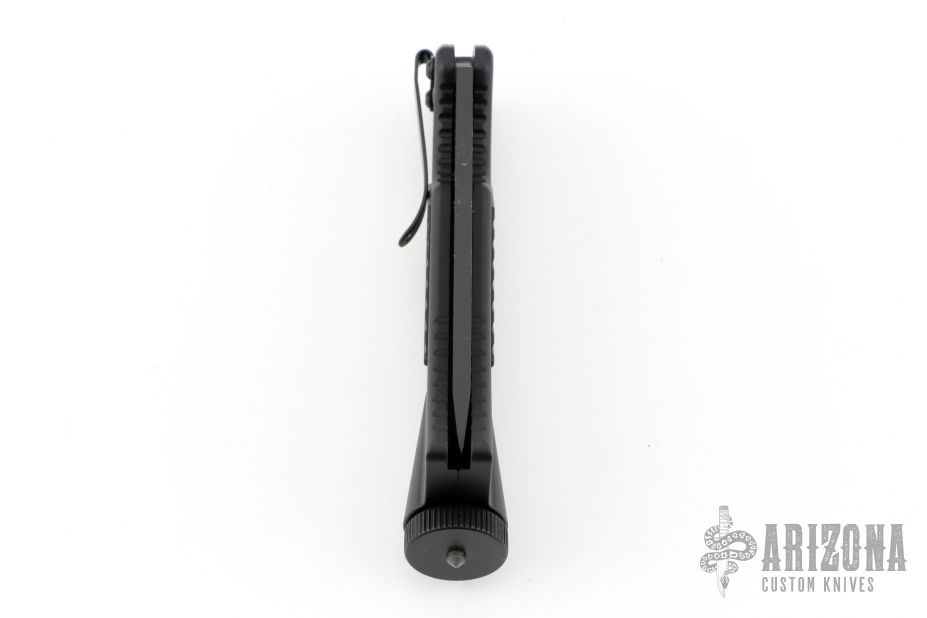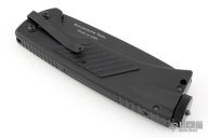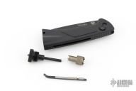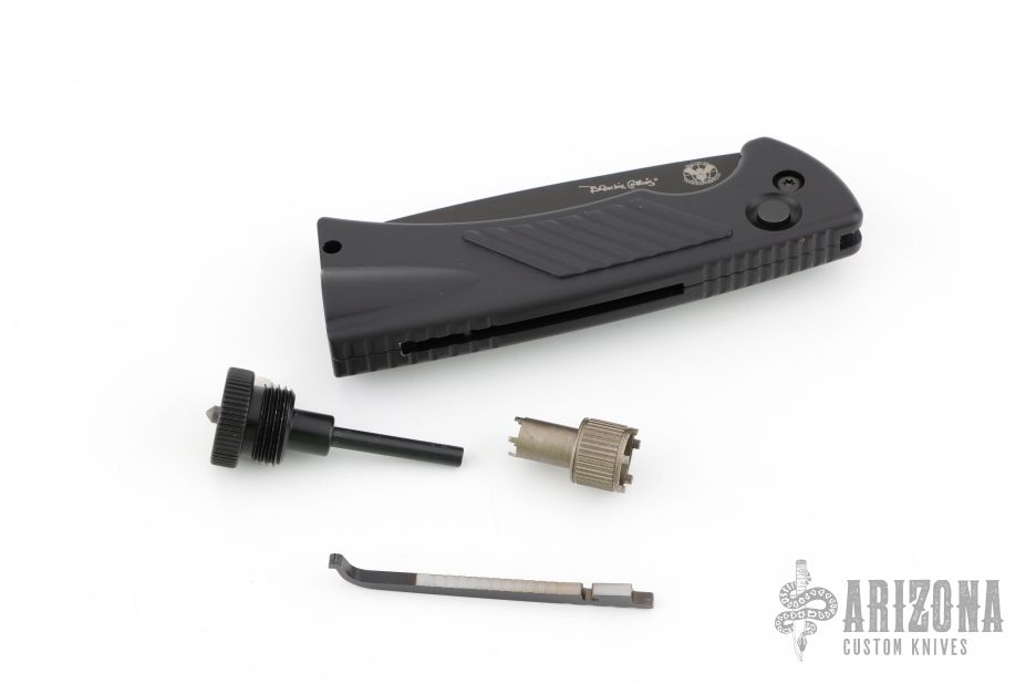 The Blackie Collins Rifleman from Meyerco is an automatic knife that has tools to service AR style platforms. The 6061-T6 aluminum handle has a threaded aluminum cap with a magnesium fire starter and sight adjustment tool. Tucked neatly into the spine of the handle is a stainless steel cartridge extraction tool with DLC coating. The extractor is held in place with the pressure fit from the machined aluminum cap that screws into the handle. This knife also features a 154-CM stainless steel tanto blade (partially serrated), tip-down pocket clip and tungsten carbide glass breaker tip.