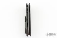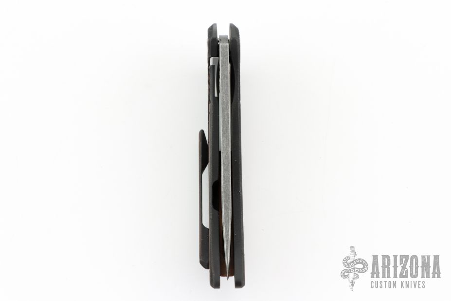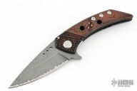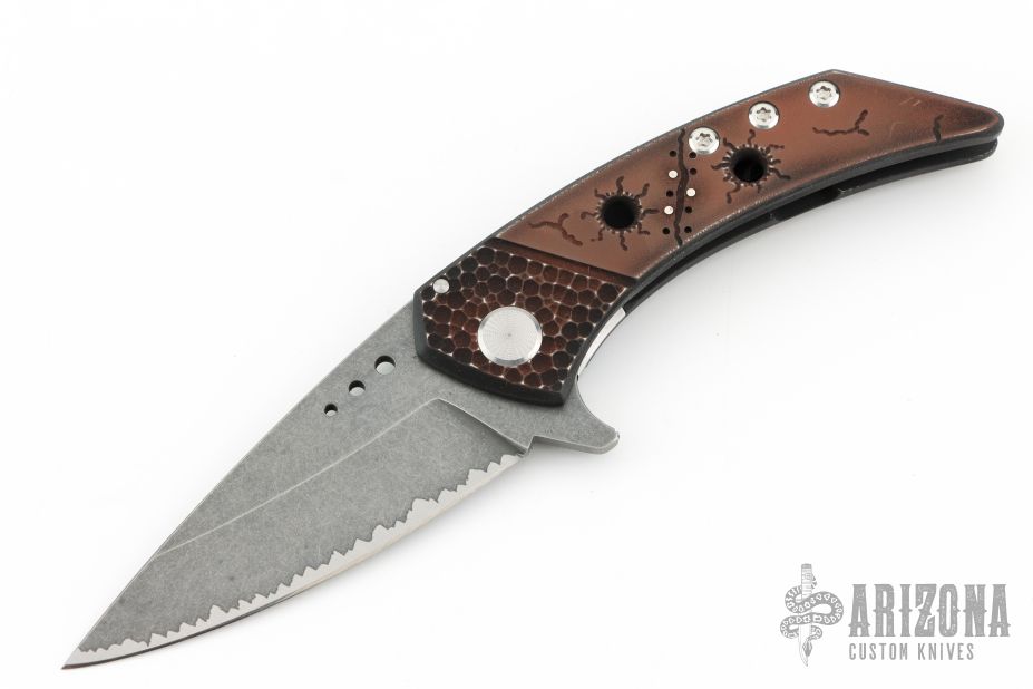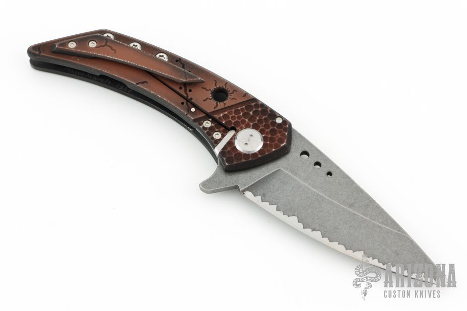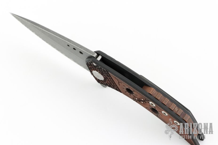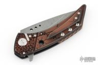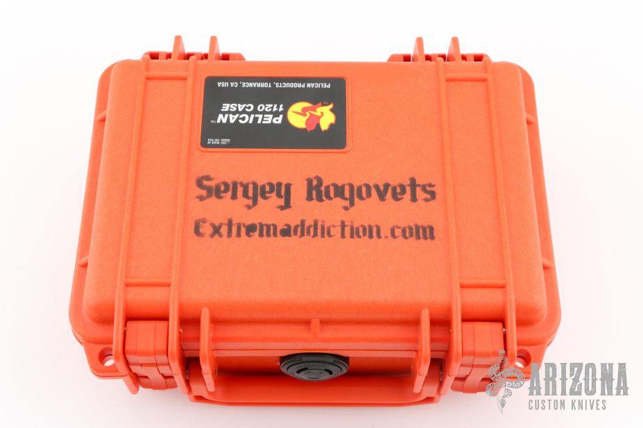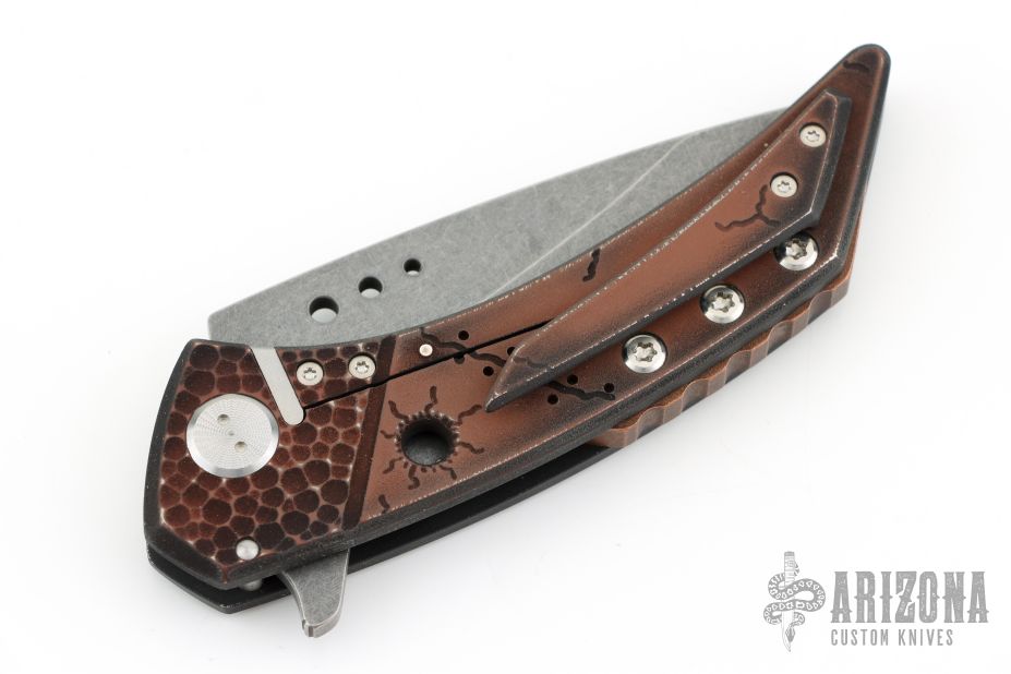 This Model 21 framelock flipper from Sergey Rogovets features a spear point blade with tumble finish and simulated hamon, has flipper. The handle has a milled/carved anodized titanium frame, copper backspacer and a matching titanium pocket clip, tip up carry, notched backspacer. Blade is centered when closed and opens smoothly. Locks up with no play, has a D2 lockface insert. Knife is in excellent condition. Great design. Signed inside frame #1857. Comes with original hard case.
