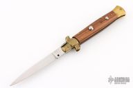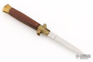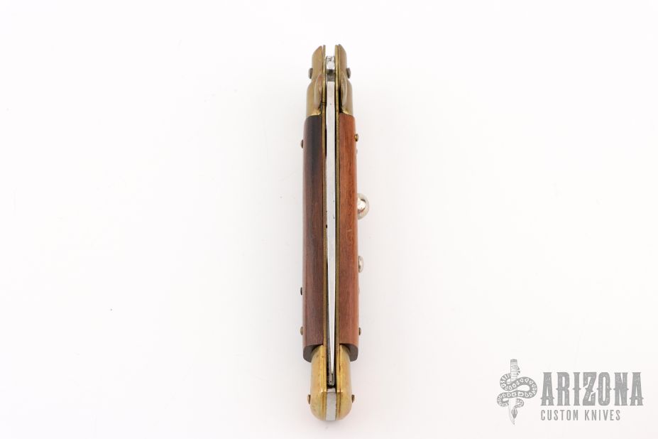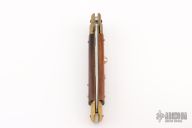 This Swivel Bolster by Cotelliere Maniago Italia features a tumble finished blade. The handle has brass bolsters, front and rear, wood scales and brass liners. Has safety. Has some patina, otherwise excellent condition.