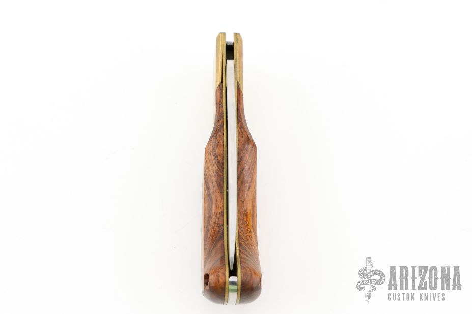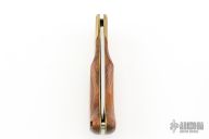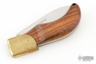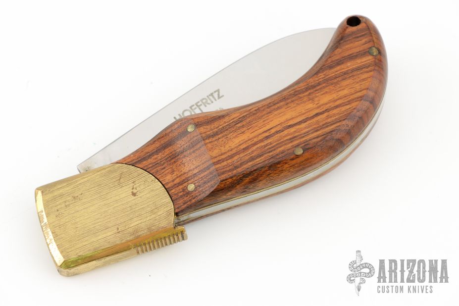 The San Salvador by Maserin is a traditional lockback folder with a unique lockback mechanism built into the bolster. The stainless steel 3.125" satin finish drop point blade on this two-handed opener is easy to open and close thanks to its wide belly. The handle has brass swiveling bolsters, wood scales, brass liners, steel backspacer. Push down on the back of the bolsters to close the knife. Has some patina, otherwise excellent condition for its age. Made for Hoffritz in Italy.