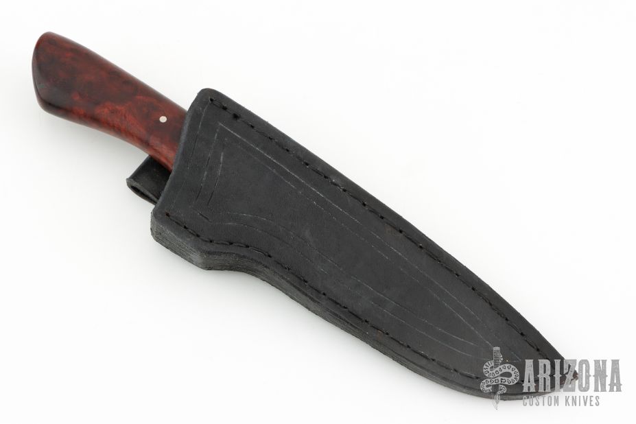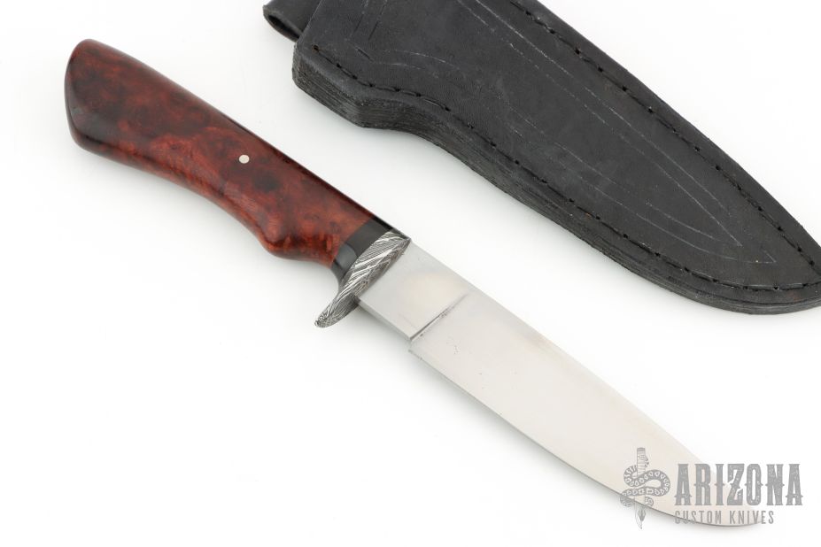 This knife by Master Smith Tom Ferry features a hand rub satin finished blade with double hamon, .203" blade stock and 1.230" blade depth, hidden tang construction. The handle has a Damascus guard, amboyna burl wood grip and an ebony wood spacer. Comes with a black leather sheath with belt loop. Has a couple light scratches and a couple small spots on the blade, otherwise excellent condition. "FERRY" on the blade spine.