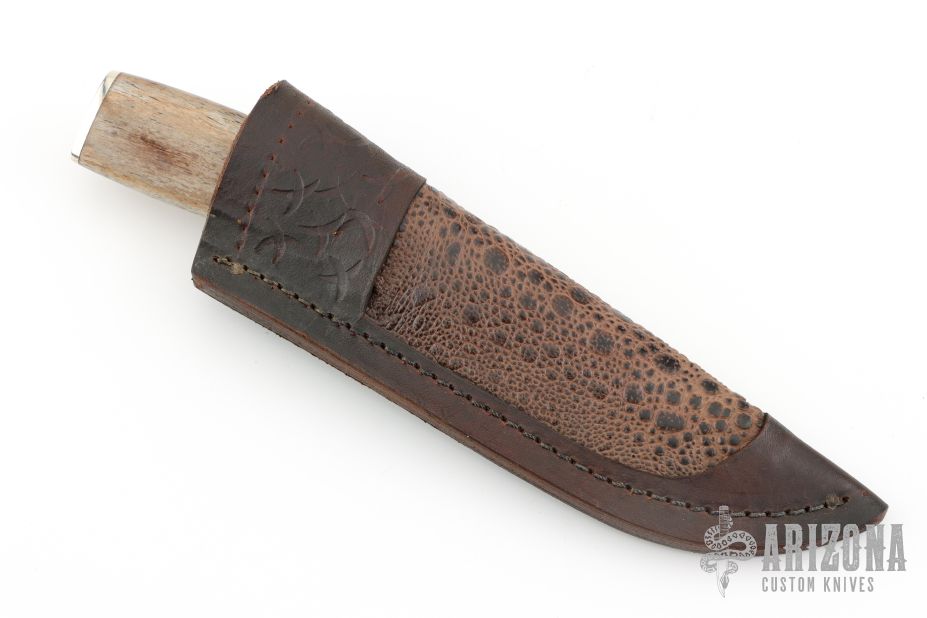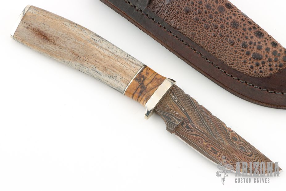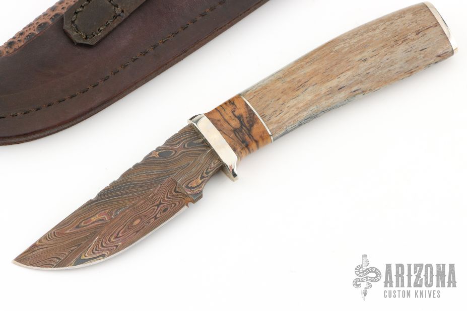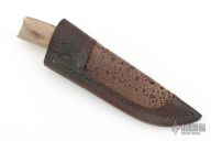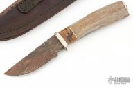 This Hunter by Herb Derr features a Damascus blade with fileworked spine, .186" blade stock and 1.179" blade depth, hidden tang construction. The handle is comprised of a nickel silver guard with spalted maple and nickel silver spacers and a giraffe bone grip, nickel silver butt. Includes a brown leather sheath with exotic skin inlay. Excellent condition. Comes with COA