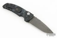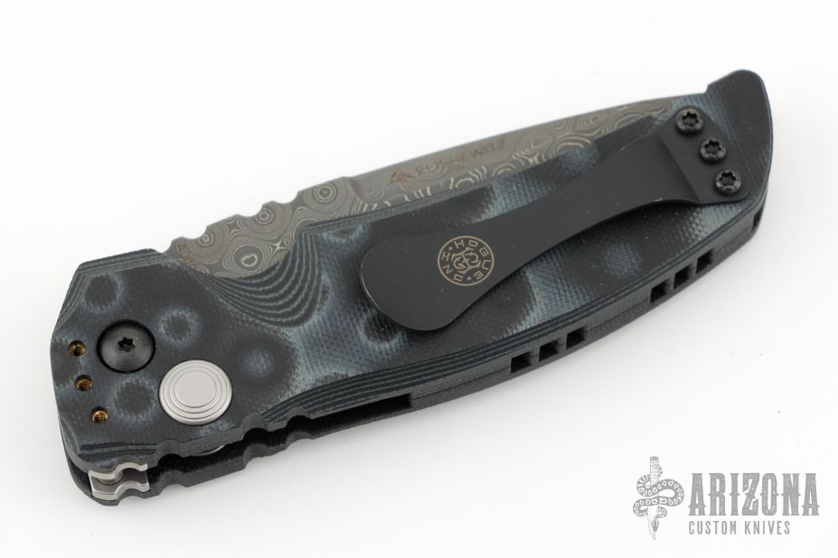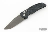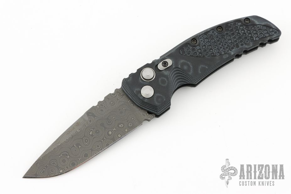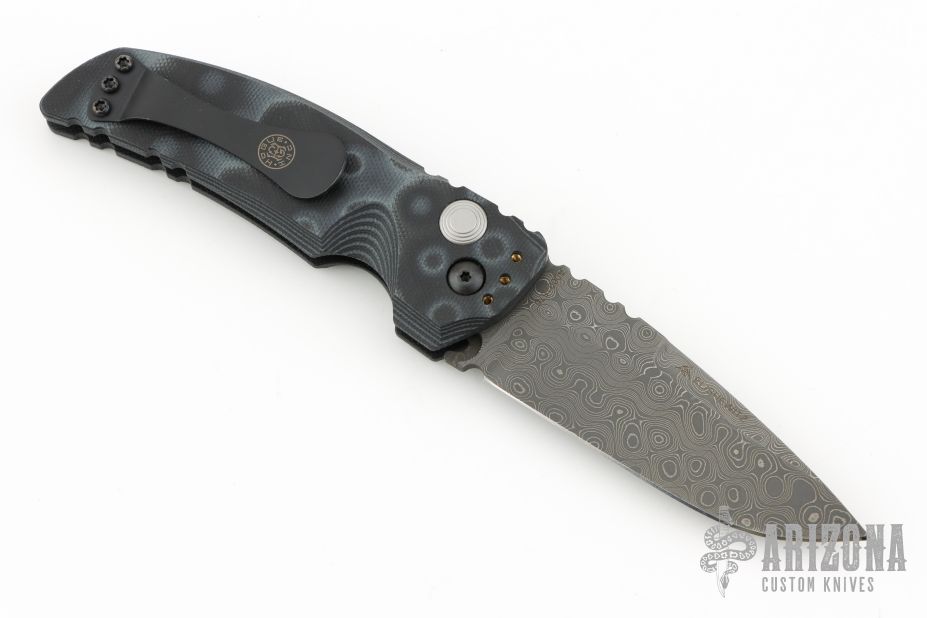 This EX-01 Auto by Hogue is an Allen Elishewitz design and this one was hand ground by Allen. It has a Damascus blade with notched thumbrest. The handle has milled G-Mascus G-10 frame with button lock, safety and tip down carry clip. Includes original box, papers and nylon sheath. Excellent condition.
