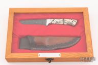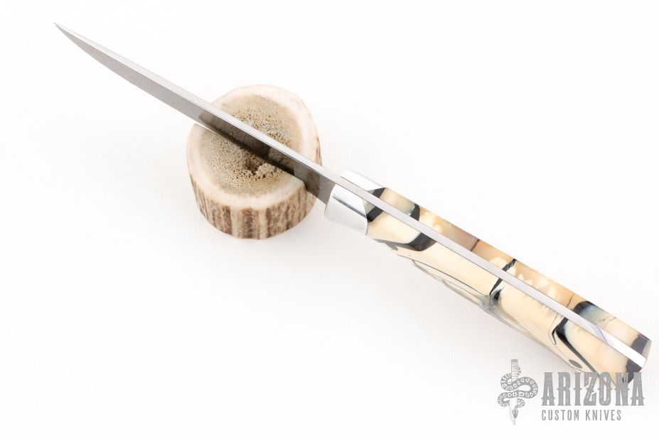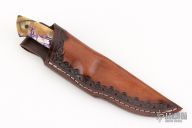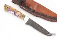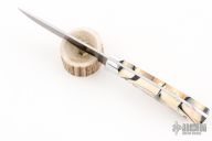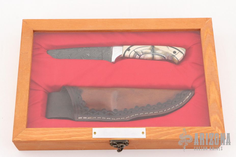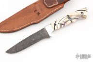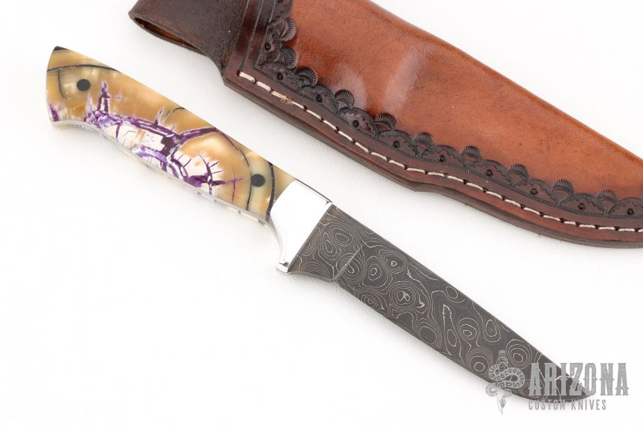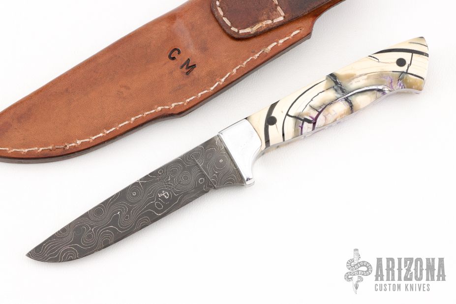 This knife by Curtis Morse features a Damascus blade with .111" blade stock and 1" blade depth, full tang construction. The handle has dovetailed aluminum bolsters, stabilized and crosscut mammoth ivory scales with black pins. Comes with a hand tooled brown leather sheath, a glass case. Excellent condition.
