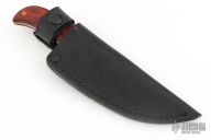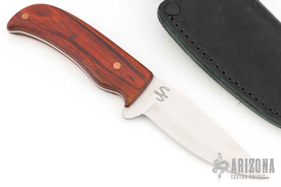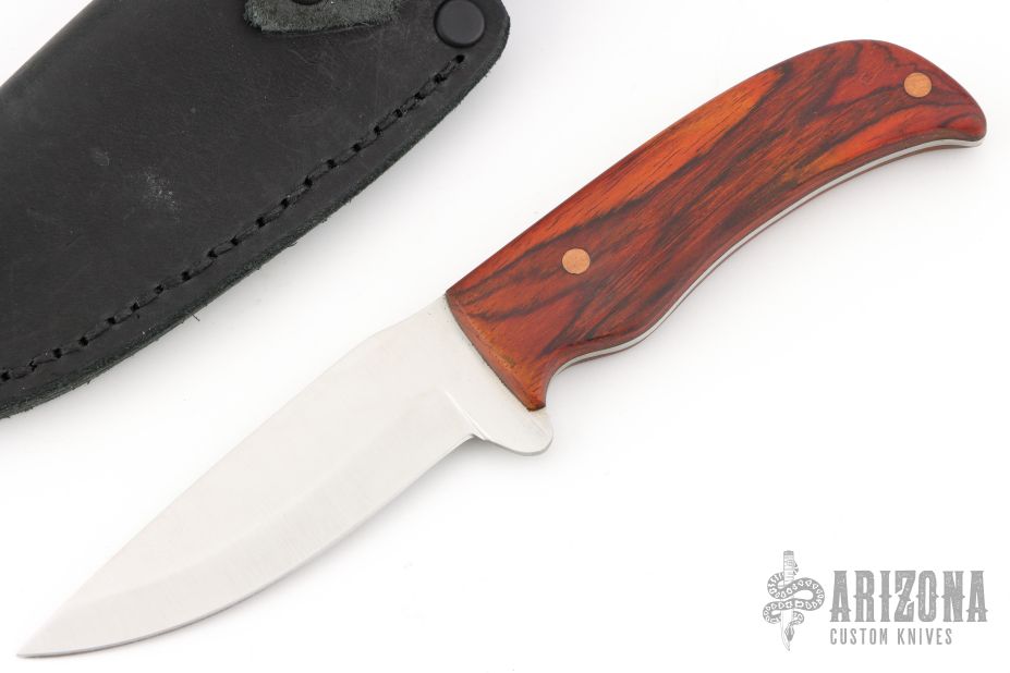 This knife by Smoky Steel Knives features a satin finished blade with .093" blade stock and 1.003" blade depth, full tang construction. The handle has cocobolo scales with copper pins. Comes with a black leather sheath and COA. New from maker.