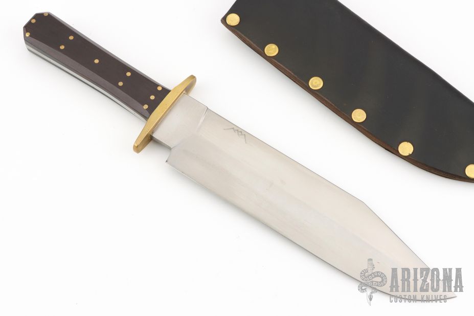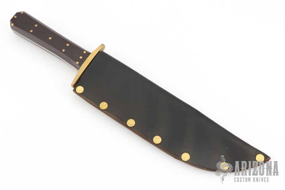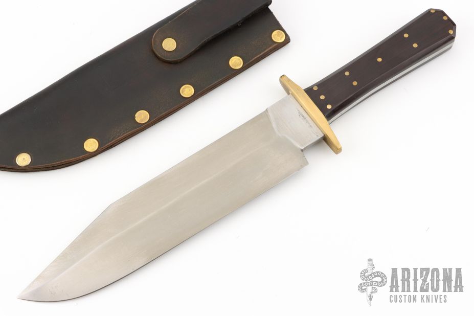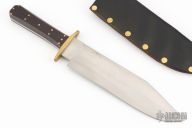 This Cliff Canoe Knife by Idaho Blade Works features a satin finished blade with false top edge, .216" blade thickness and 2.007" blade depth, full tang construction. The handle has a brass guard with dark wood scales and brass pins. Has a couple light oxidation spots, otherwise excellent condition. Includes a black leather sheath with belt loop.