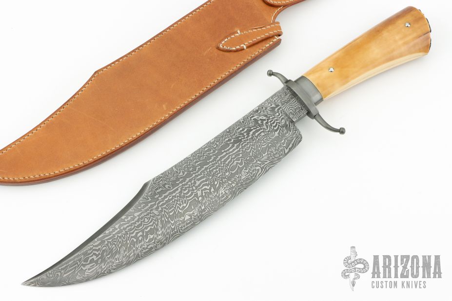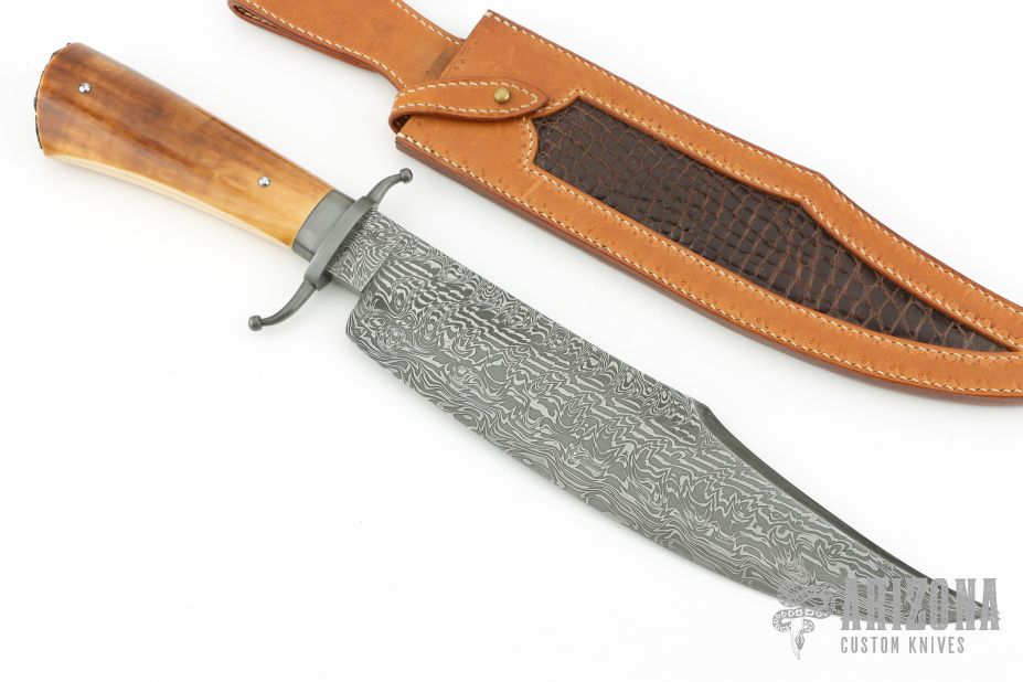 This Soutwest Bowie from Master Smith James R Cook features an beautiful Damascus blade with a nearly sharpened top edge, .307" blade stock, 2.024" blade depth, hidden/mortise tang construction. The handle has a darkened steel guard and collar, 2-piece fossil mammoth ivory grip with domed steel pins, a carved leaf Damascus butt plate. Comes with a hand tooled brown leather sheath with alligator skin inlay. Comes with a zippered case. Excellent condition.