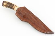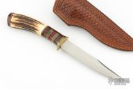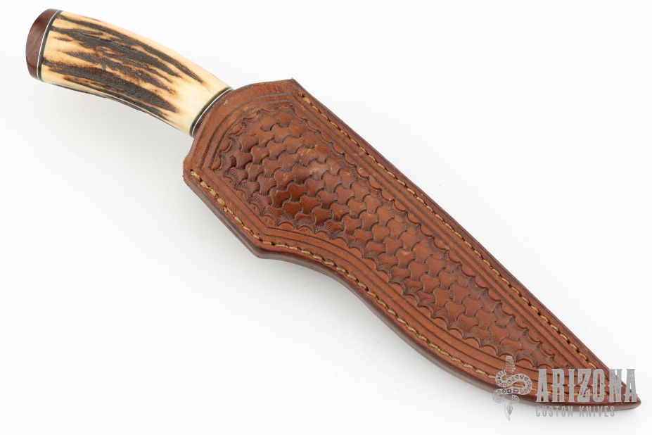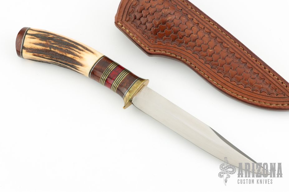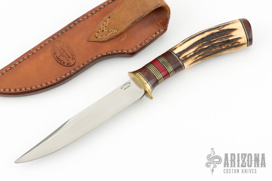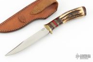 This hunter by RL Welling features a hand rub satin finished blade with false top edge, .268" blade stock and .894" blade depth, hidden tang construction. The handle has a brass guard, stag grip, ironwood butt, and a spacer pattern of black/nickel silver/ironwood/brass/black spacers. Comes with a hand tooled brown leather sheath. Has some scratches on the blade, otherwise excellent condition.
