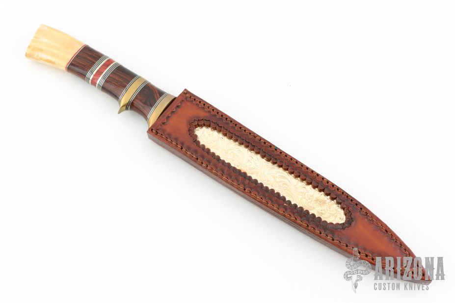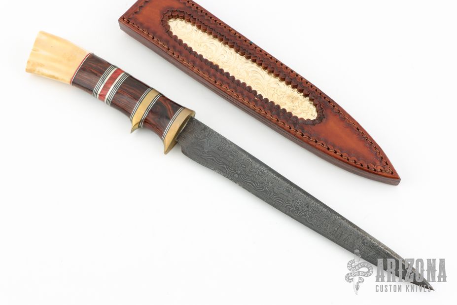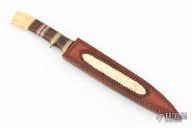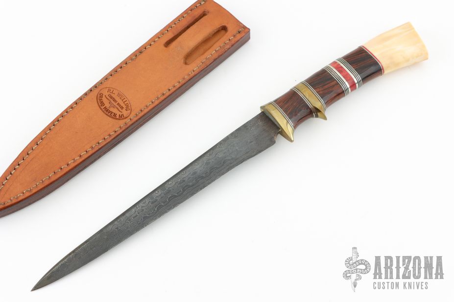 This Fighter from R.L. Welling features a Damascus blade with false top edge, .209" blade stock and 1.080" blade depth, hidden tang construction. The handle has a brass guard and sub-hilt, walrus ivory butt, and a spacer pattern consisting of black/nickel silver/cocobolo/red maple burl. Includes a hand tooled brown leather sheath with belt loop and an engraved nickel silver inlay.