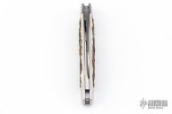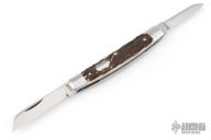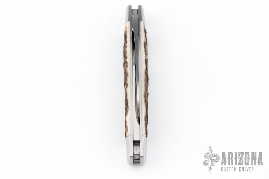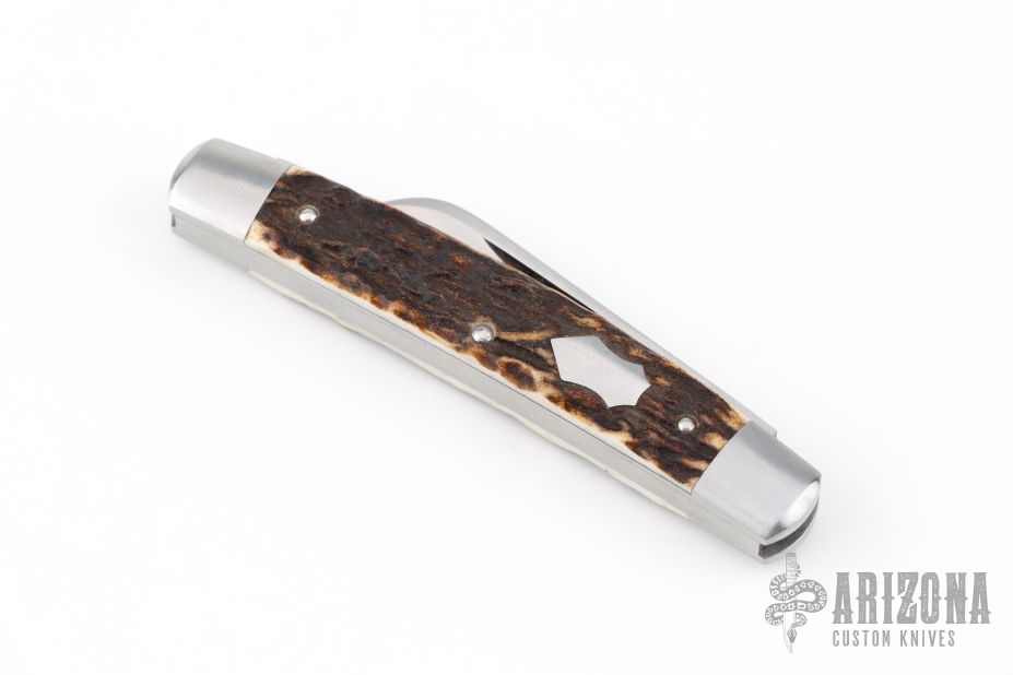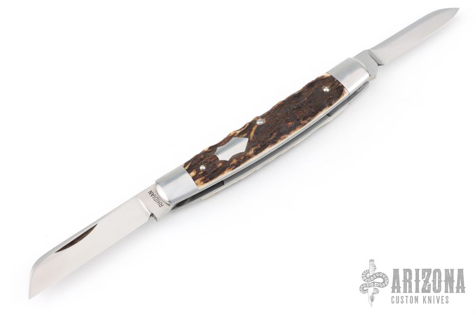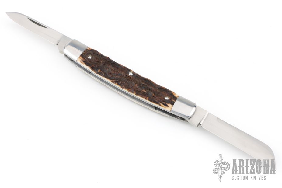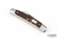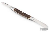 This Congress Slipjoint by Rhidian Gatrill features hand rub satin finished blades with nail nicks. The handle has stag covers with stainless steel bolsters, escutcheon, liners and spring. Has half-stops, flush in all positions. Comes with a zippered case. Excellent condition.