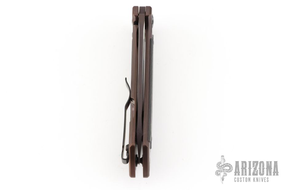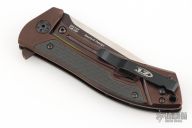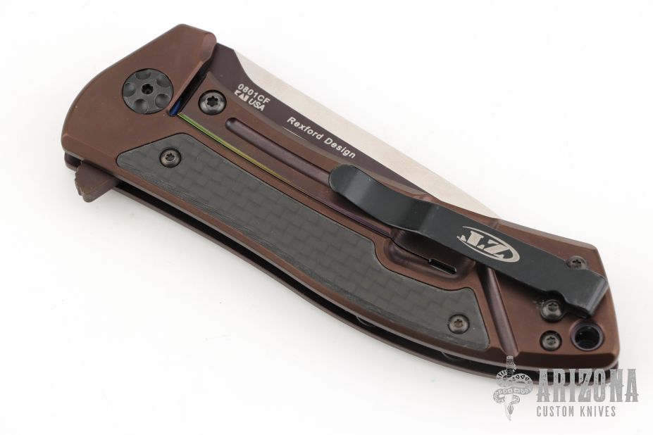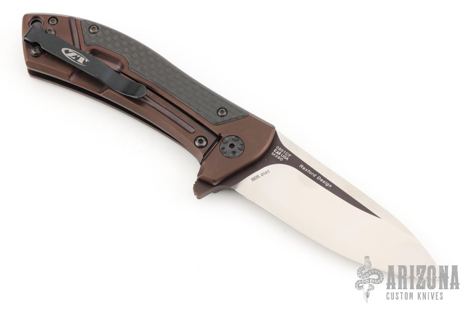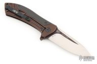 This 0801CF Rexford Limited Edition Copperhead Flipper #0045 has a two-tone satin and black M390 stainless steel drop/spear point blade. Handle is anodized titanium with carbon fiber overlays, black finished stainless steel tip up (RH/LH) clip, and lanyard hole. Includes the original box.  Excellent Condition.