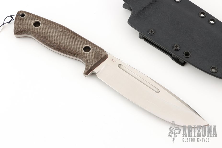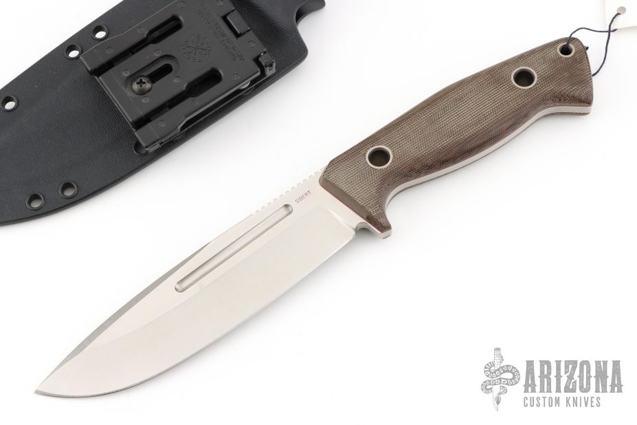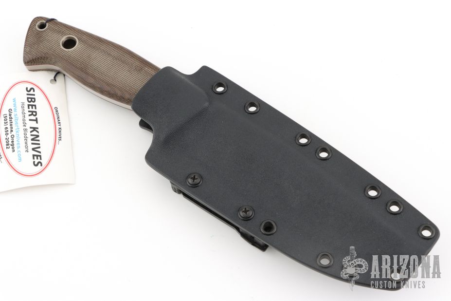 This Endurance XL Prototype by Shane Sibert features a satin finish with fullers and notched thumbrest, .214" blade thickness and 1.528" blade depth, full tang construction. The handle has a brown canvas micarta scales with red liners. Comes with a kydex sheath and COA dated 9-30-09. Excellent condition.