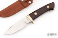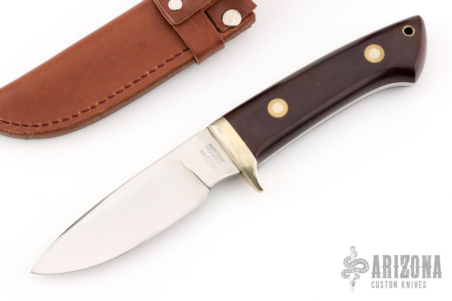 This knife by Khyber has a mirror polished drop point blade with .154" blade stock and 1.104" blade depth, full tang construction. The handle has a nickel silver guard, black linen micarta scales with a lanyard hole. Comes with a brown leather sheath. Has a few light scratches, otherwise excellent condition.