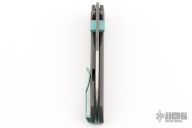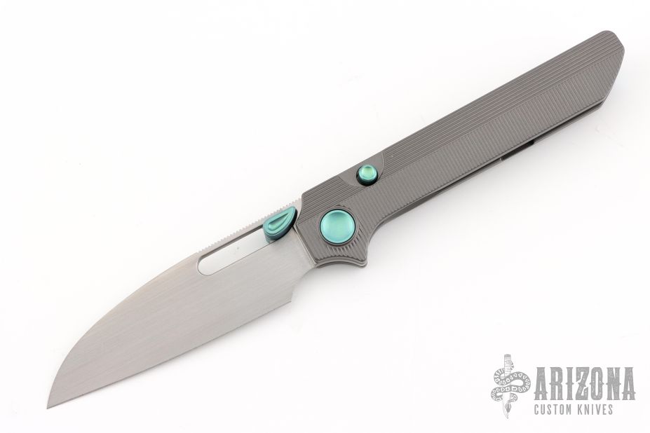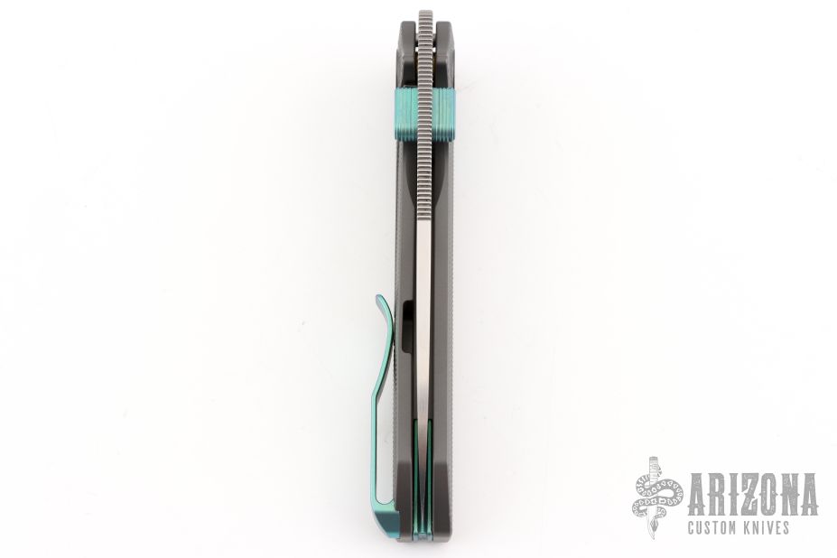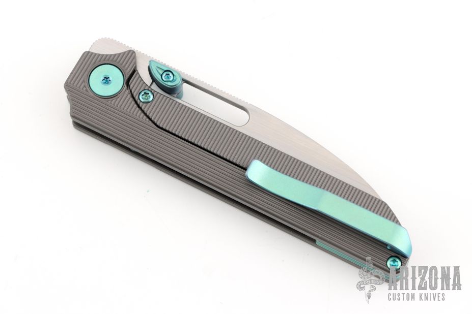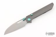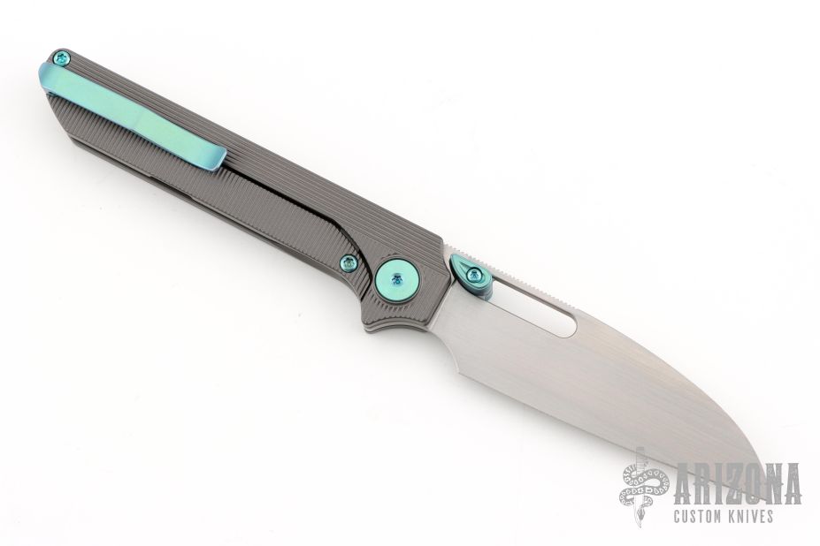 This SLIM by Golden Designworks features a hand rub satin finished blade with thumbhole, dual thumbstuds and notched thumbrest. Works well as a front flipper. The handle has milled and smoke finished titanium scales, sage anodized titanium backspacer and tip up clip. Comes with original box, zippered case and papers. Excellent condition.