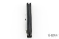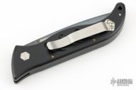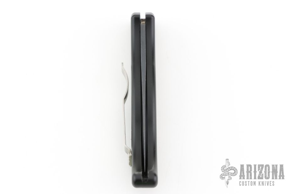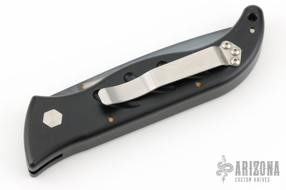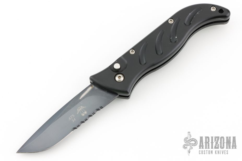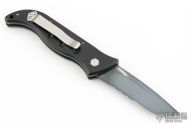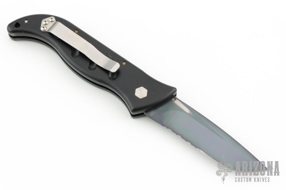 This auto by Barrel Industries features a black partially serrated blade with false top edge. The handle has a black aluminum frame with tip up clip. Has some light scratches and some wear on the handle finish, otherwise good condition. Comes with a zippered case.