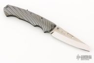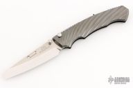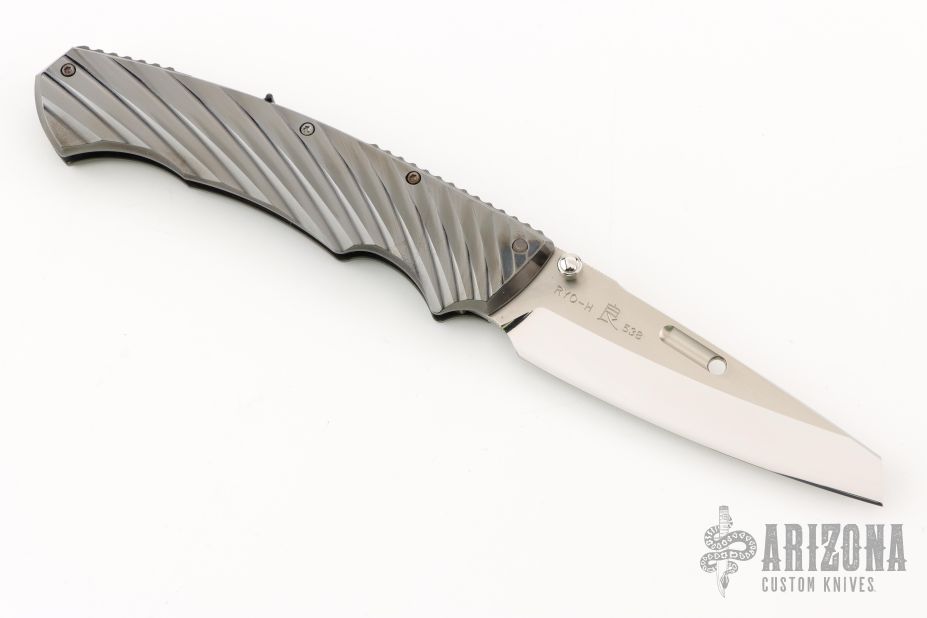 This RYO by Rockstead features a mirror polished blade with dual thumbstuds and a notched thumbrest. The handle has DLC coated titanium frame with retractable clip and lanyard hole at the butt. Comes with original box and papers. Excellent condition. #H538.