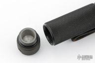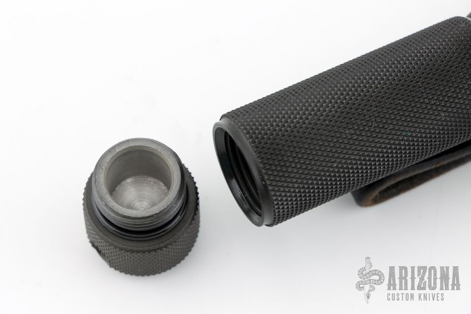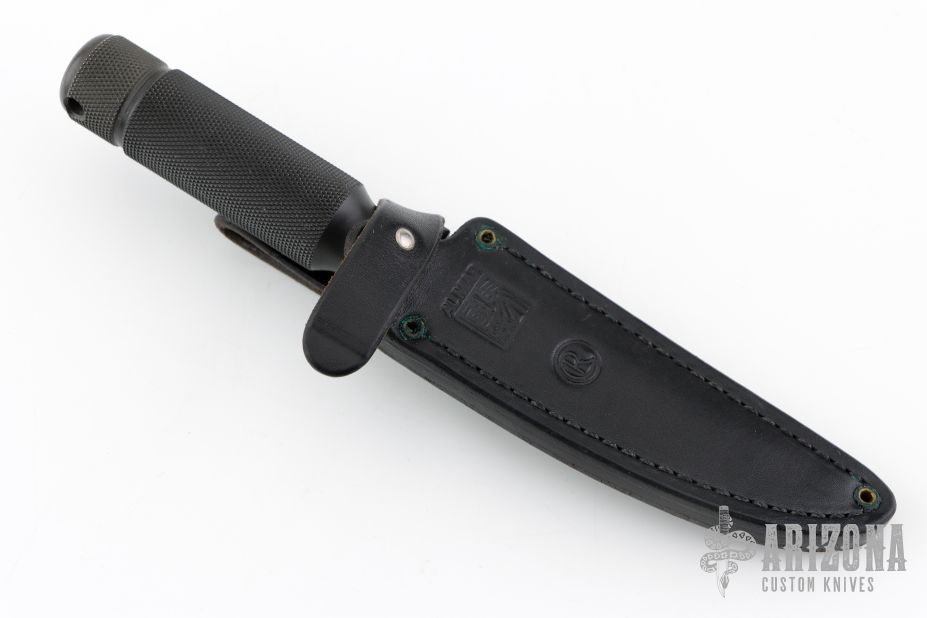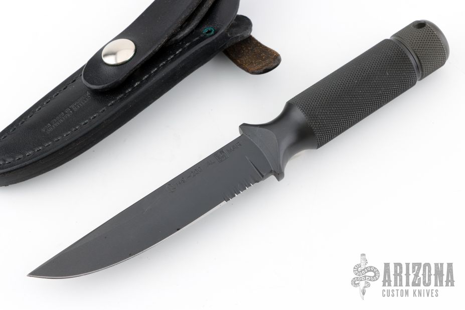 This knife is a collaboration between Chris Reeve and Al Mar, .188" blade thickness and .860" blade depth. Approximately 1" of the blade is serrated. Rear end of handle unscrews and allows the inside of the knife to be used as a storage area. The blade is numbered 149 of 200. Includes original sheath and a reissued COA with manufacture date of 1999, and a reissue date of Dec 4, 2004. Excellent condition.