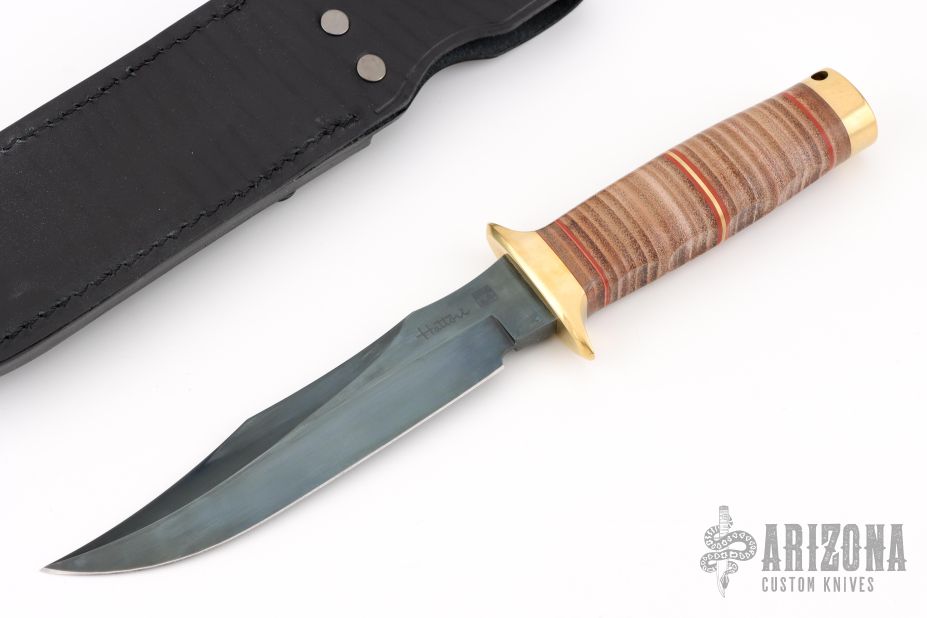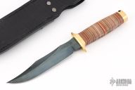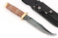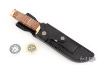 Master Hattori has reproduced 50 special limited Anniversary knives, and just came up in right time of the 50th Anniversary year and month. It features original 6-1/4" Hollow ground Gunblued SK-5 carbon steel Bowie blade etched with "Vietnam War 50th Anniversary 1955-1975" and "50 Limited Edition of MACV-SOG Knife" on blade, and "De Oppresso" Special Forces Crest on tang. Each serial number is engraved on the bolster. The stacked Leather handle has Red Fiber & Gold Brass spacers (Vietnam flag colors) and solid Brass bolster & butt end.