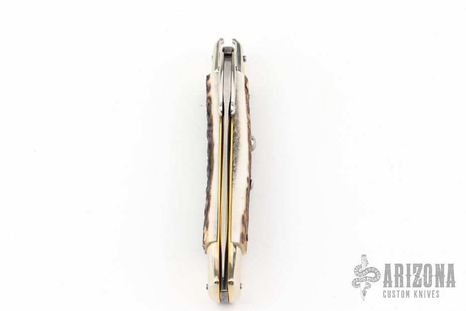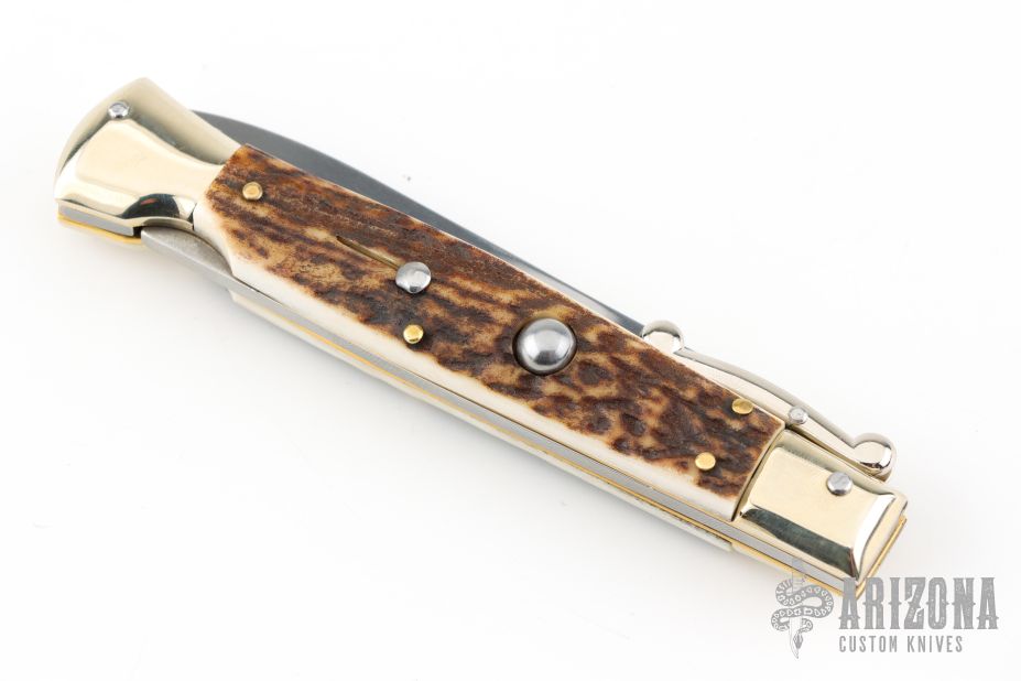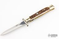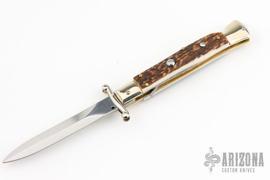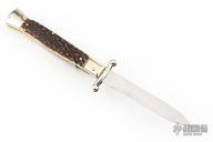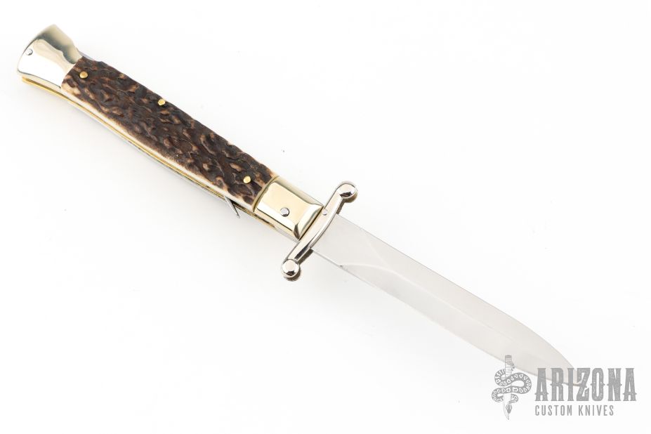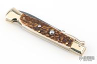 This 9" Swinguard Auto from A.G.A. Campolin has a mirror polished stainless steel spear point blade with false top edge. Handle has stag scales with mirror polished nickel silver bolsters and pommel, brass liners, brass pins, stainless steel back spacer, and a safety. Comes in original tube with COA. Has a couple light scratches, a little side to side play, otherwise excellent condition.