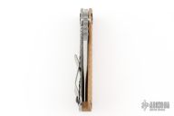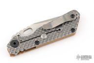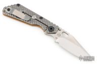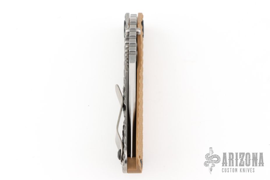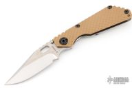 This SNG DGG by Strider has a satin/stonewash finished Bowie blade with dual thumb studs, thumb hole, and notched thumb rest. Handle has a coyote G-10 and bead blasted titanium "Gunner Grip", lockbar stabilizer, and titanium tip up clip. Nice detent, lockup and blade seating.  New Conditon.