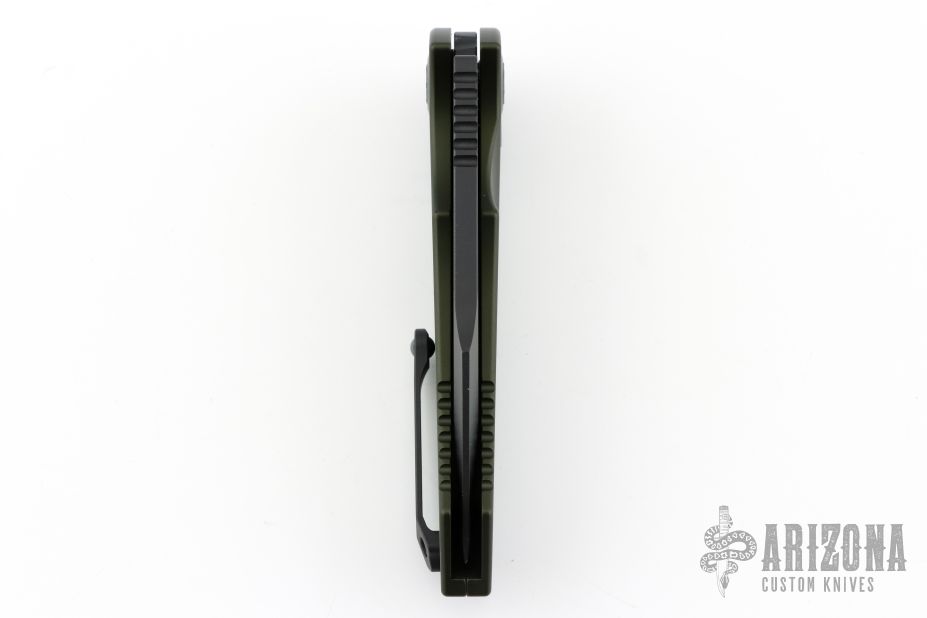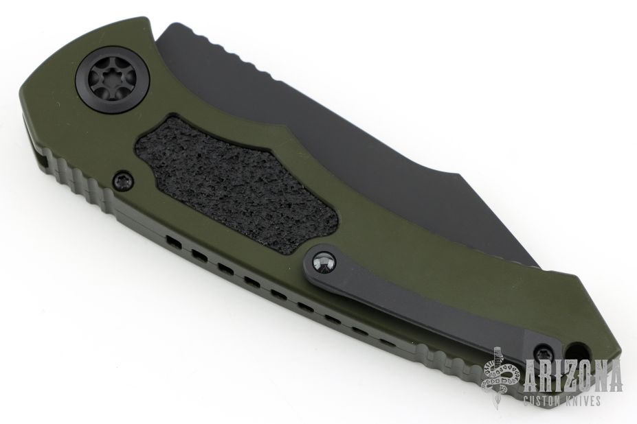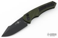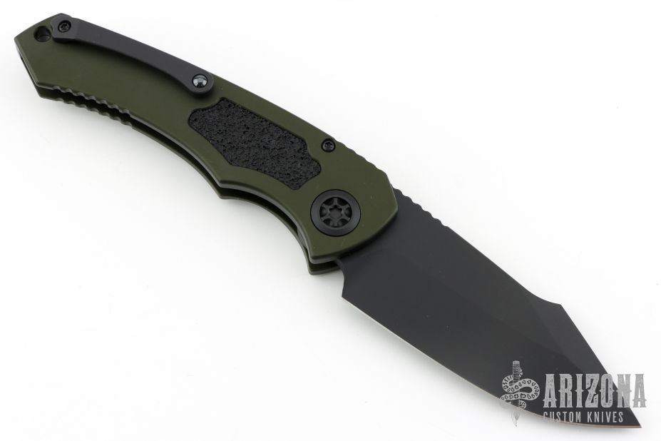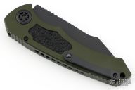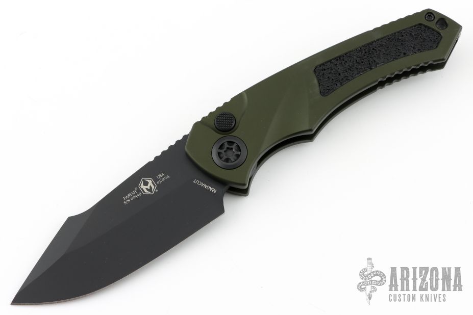 This Pariah Auto by Heretic Knives features a black blade with notched thumbrest. The handle has an OD Green aluminum frame with black rubber inserts, black titanium pivot collars and a tip up black stainless steel clip with ceramic ball. Comes with original box. S/N 00449. Dated 03/2024. Excellent Condition.