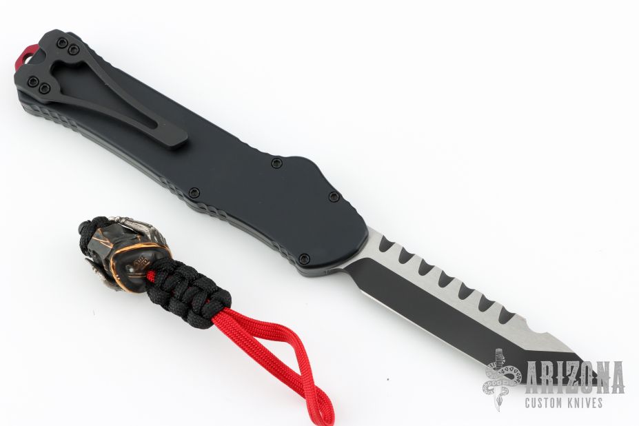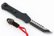 This Hydra Predator by Heretic Knives features a black tanto blade. The handle has a black/red aluminum frame, stainless clip, stainless steel and matching charging handle. Comes with original box and bead. Excellent condition.