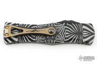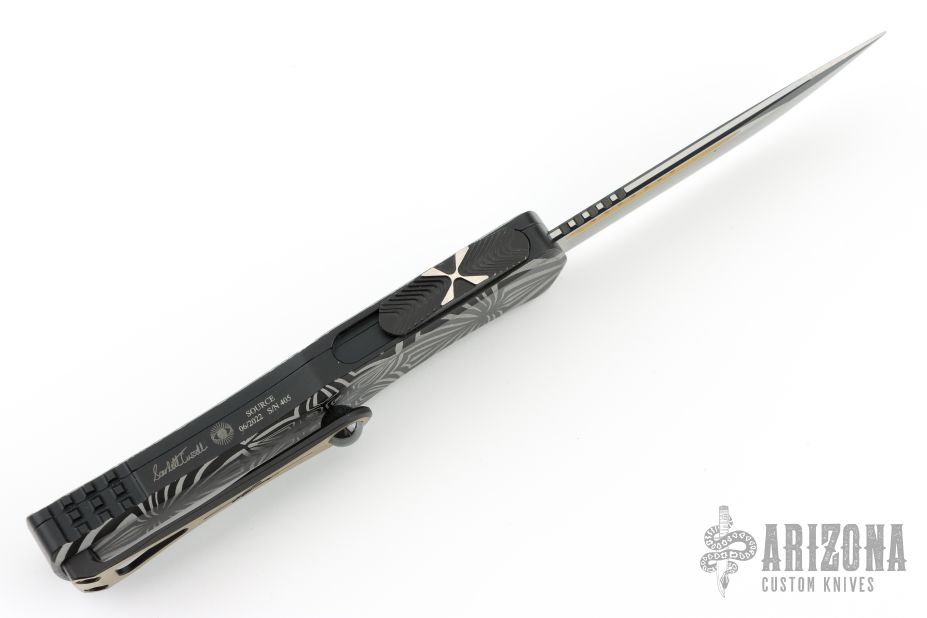 This Hera by Microtech Knives features a single-edged blade with fullers. The handle has a black aluminum frame with "Source" artwork, a tip down titanium clip with ceramic ball inset. Dated 06/2022 and s/n 405. Comes with original box and papers. Has a couple light scratches, otherwise excellent condition.