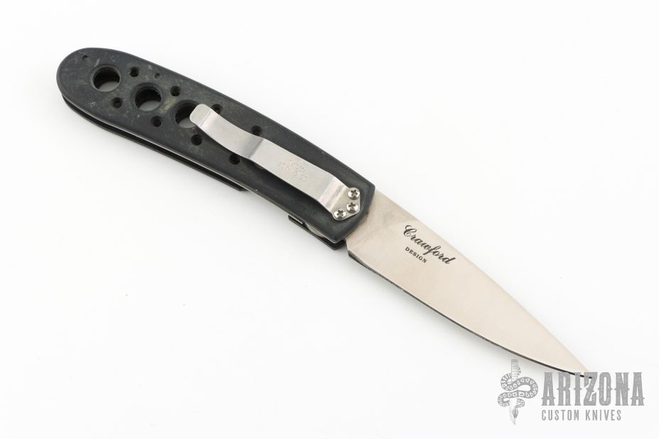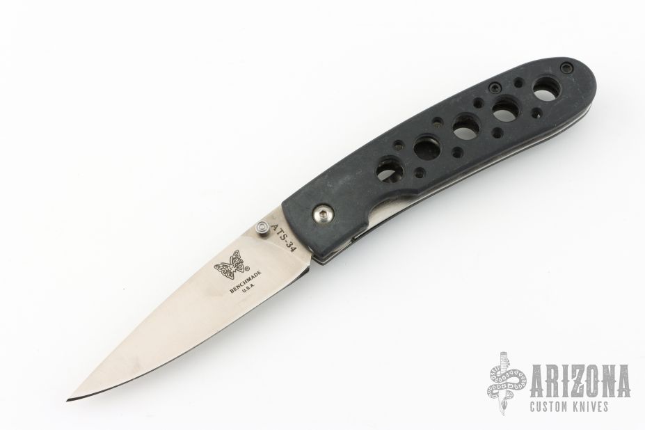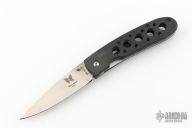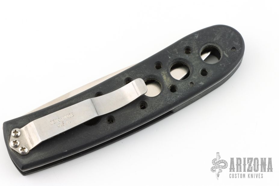 This Leopard Folder by Benchmade features a satin finished blade with a single thumbstud. The handle is comprised of a black aluminum frame and features a tip down pocket clip. Comes with original box and papers. Has some light scuffs and wear on the frame, good condition otherwise.