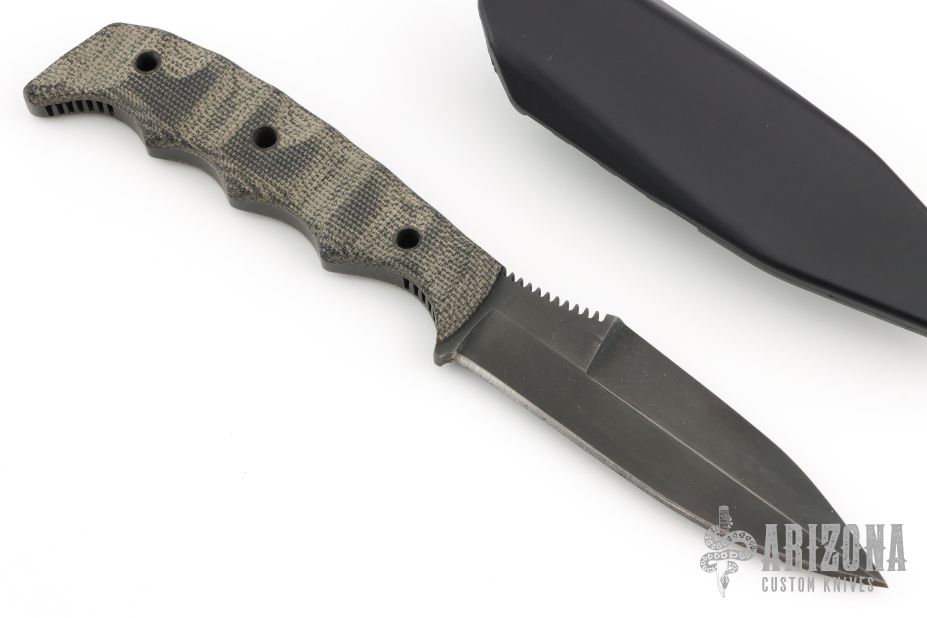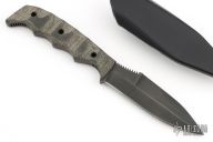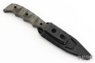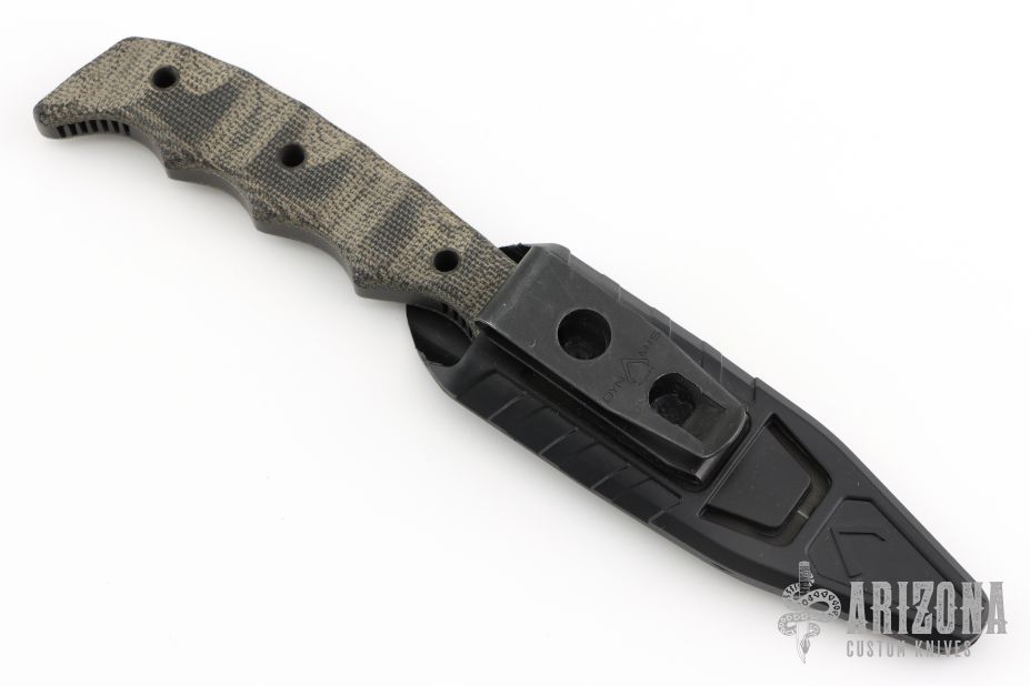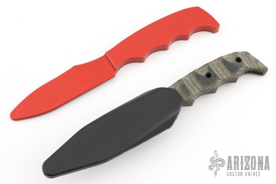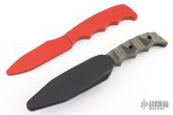 This Dynamis Alliance fixed blade was crafted by Daniel Winkler. IT features a spear point blade with false top edge and notched thumbrest. The handle is comprised of sculpted black canvas micarta scales over full tang construction. Jimping on pommel provides purchase when holding in the reverse grip. Includes a molded plastic sheath with metal clip. Includes original box and papers. Comes with red aluminum trainer. Has a couple light scuffs, otherwise excellent condition.