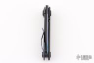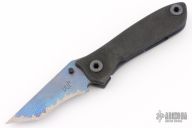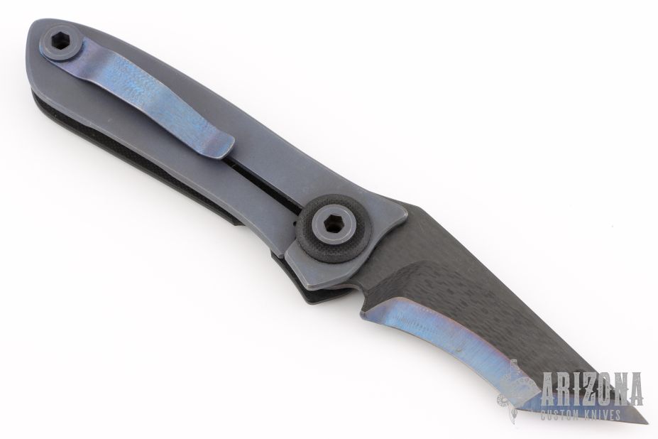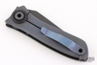 This M2 Framelock has a "fingerprint" anodized titanium and carbon fiber laminate chisel ground blade, carbidized edge and single thumbstud. Handle is black G-10 and blasted and anodized titanium with matching titanium tip up clip, and black G-10 lock stop. Nice detent, lockup and blade seating. Has some scuffs, otherwise excellent condition.