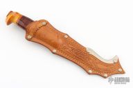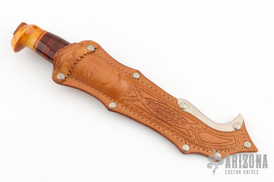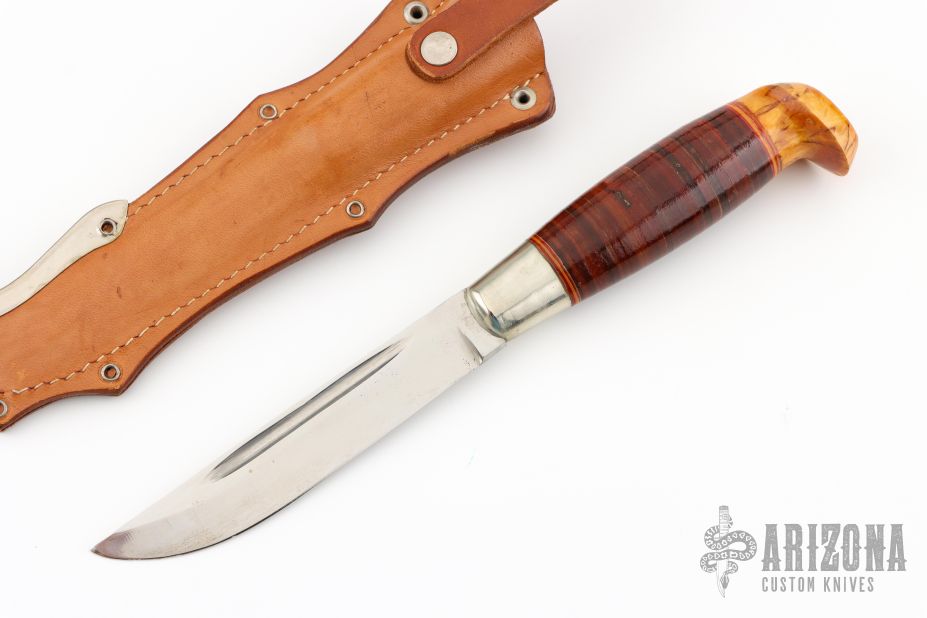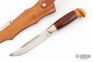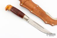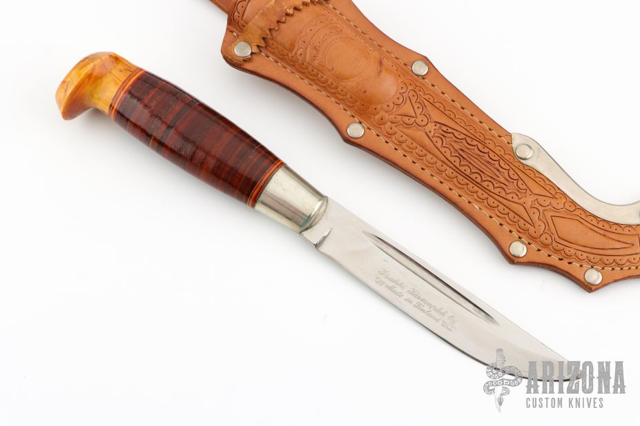 This Pukko by Iisakki Jarvenpaa features a polished blade with fullers, nickel silver fittings and stacked birch bark grip. Comes with a hand tooled brown leather sheath. Has some light scratches, and a couple small nicks in the blade, otherwise excellent condition. Comes with a zippered case.