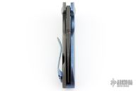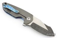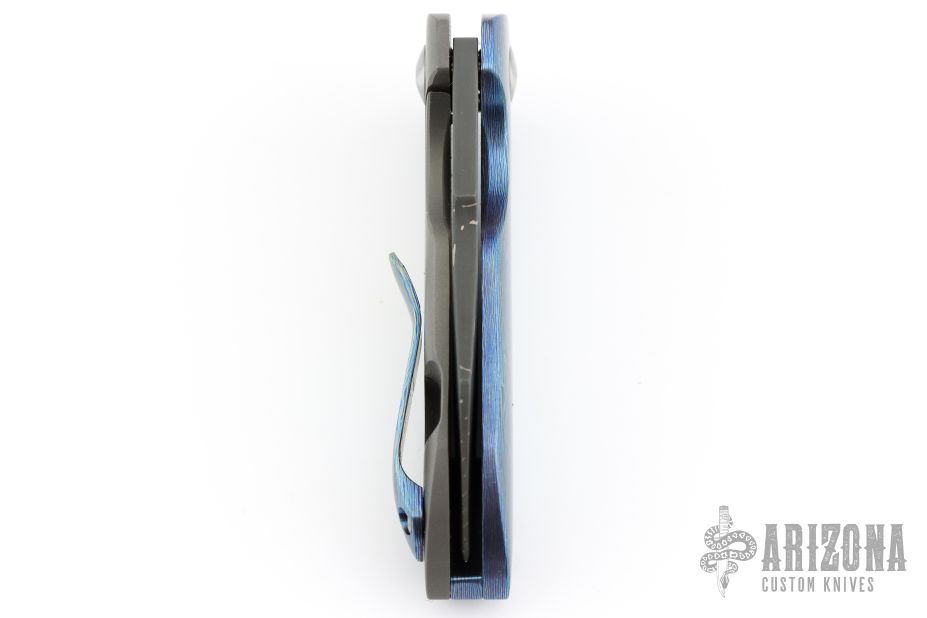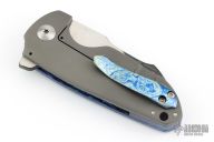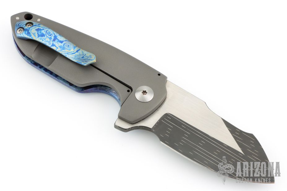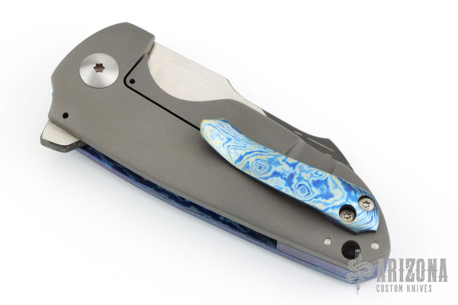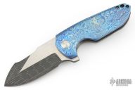 This Gent's Fatboy by Kirk Mayberry of KM Designs features a Chad Nichols Damascus blade with swedge and a flipper. The handle has a MokuTi and bead blasted titanium frame with a tip up MokuTi clip. Nice detent, lockup and blade seating. Rides on bearings. Comes with a zippered case. Excellent condition.