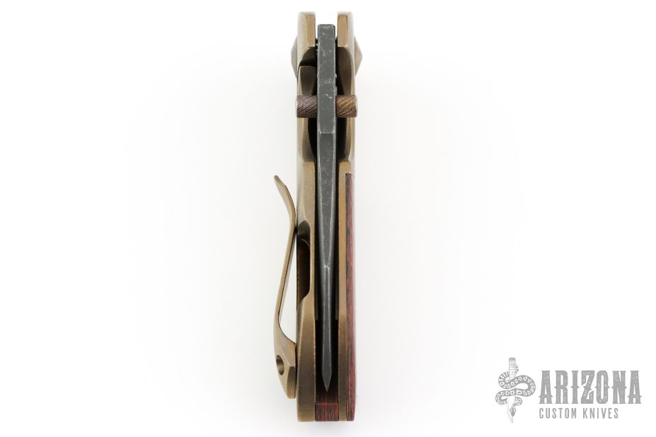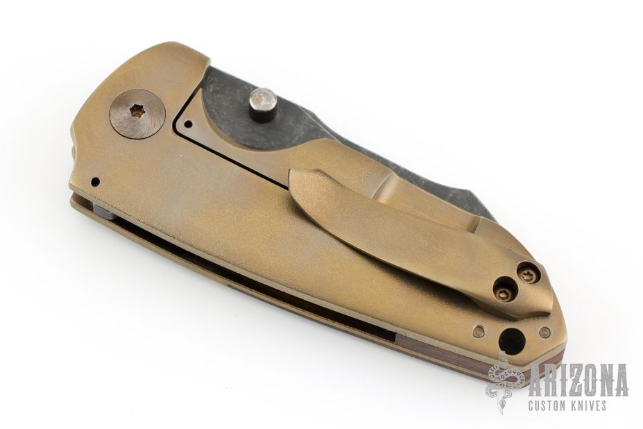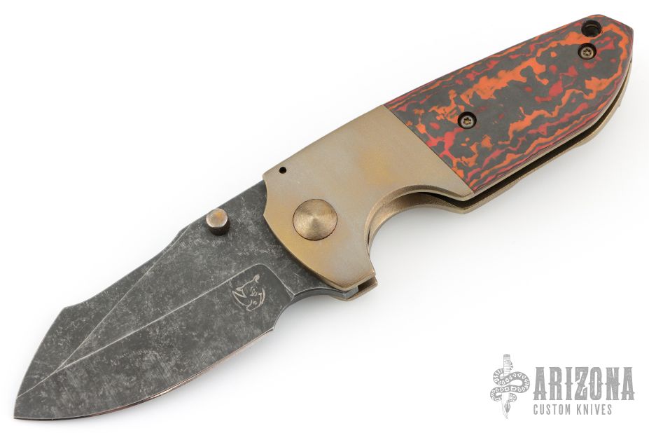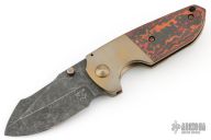 This Gent's Fatboy by Kirk Mayberry of KM Designs features an acid tumble finished blade with swedge and flipper. The handle has an anodized and orange peel finished titanium frame with Mars Valley Fat Carbon scales and backspacer, orange peel finished and anodized titanium tip up clip. Lanyard hole in pommel. Includes a zippered case. Excellent condition.