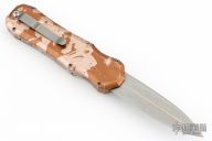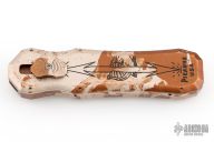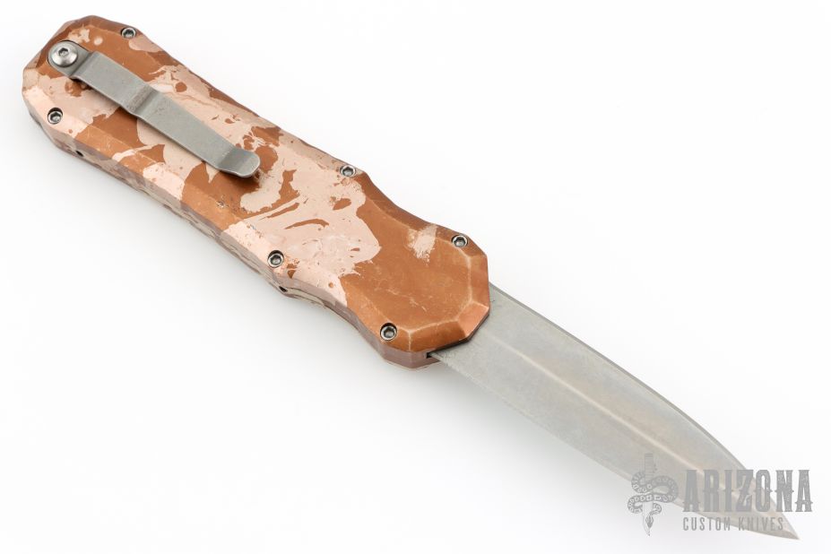 This Excalibur OTF from Piranha Knives features a stone washed double edge blade with fuller. The handle has a camo anodized aluminum with a tumbled tip down clip. Includes original packaging and paperwork. Excellent condition.