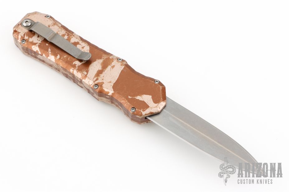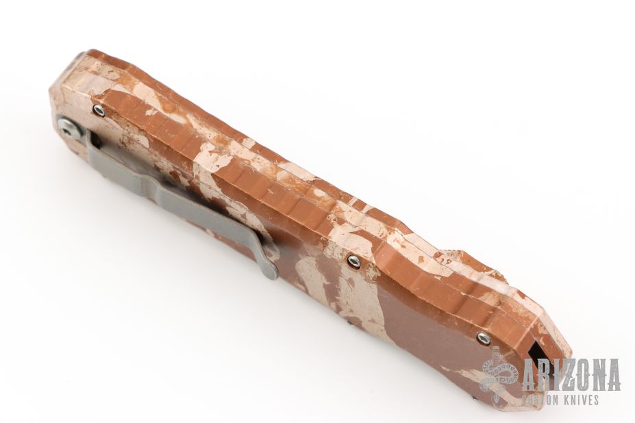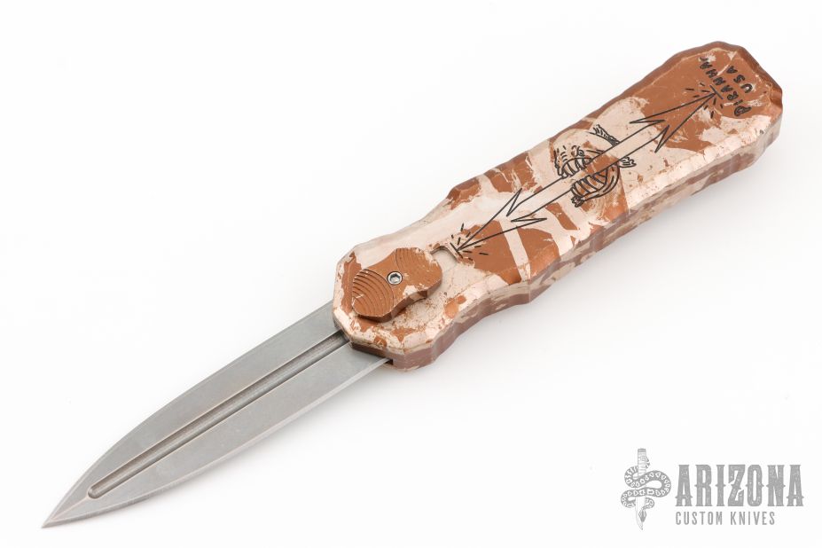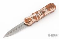 This Excalibur OTF from Piranha Knives features a stone washed double edge blade with fuller. The handle has a camo anodized aluminum with a tumbled tip down clip. Includes original packaging and paperwork. Excellent condition.