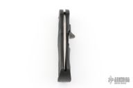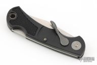 Textured black zytel handle scales. Satin finished stainless steel clip point blade. Tang stamped Camillus New York USA  -  PATENTED. The pivot pins say Camillus LEV-R-LOK. Steel lined lanyard hole. The LEV-R-LOK is a one handed mechanism that snaps the blade to the open and locked position with only mild pressure on the opening lever. Once open, function is similar to other single blade lock back knives in that the blade must be manually released prior to closing. This mechanism is 100% mechanical.