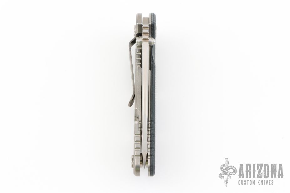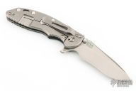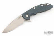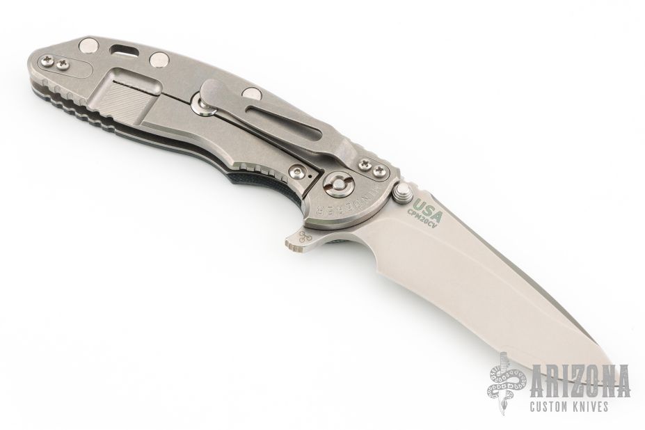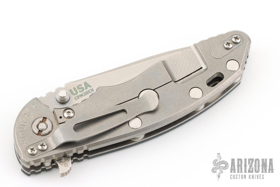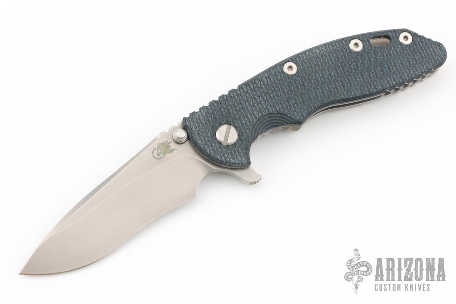 This XM-18 Flipper by Rick Hinderer Knives features a 3.5" stonewash finished blade, notched thumbrest and flipper, dual thumbstuds. The handle has a black/blue G-10 scale, and stonewashed finish titanium handle/clip. Clip can be mounted for tip up or down carry. Nice lockup, seating, and detent. Comes with extra washers/Hinderer card. Excellent condition.