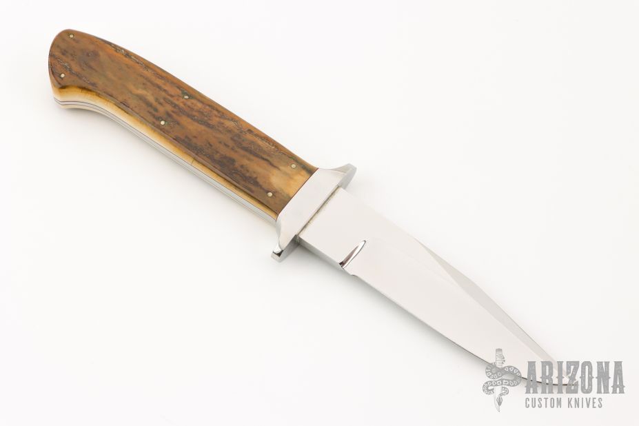 This Chute Knife by Lloyd Pendleton features a mirror polished blade with false top edge, .189" blade stock and .894" blade depth, full tapered tang construction. The handle has a stainless steel guard, mammoth ivory scales with red liners. Excellent condition.
