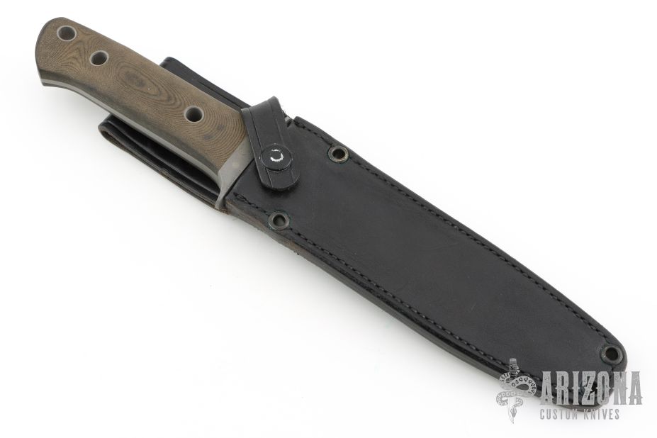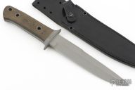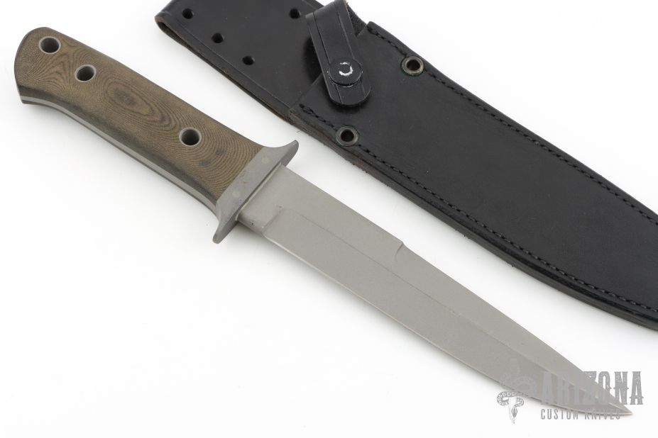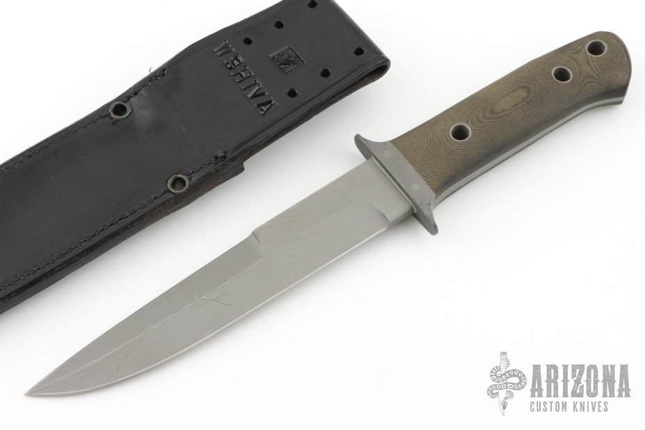 This fighter is a very special and rare knife made by Al Mar and William Harsey, it features a bead blasted blade with sharpened top edge, .245" blade stock and 1.253" blade depth, full tapered tang construction. The handle has a bead blasted stainless steel guard and black linen micarta scales. The maker's marks are hand engraved. Comes with original black leather sheath, as well as a Ka-Bar sheath. Has scuffs, scratches, and shows some wear. Good condition otherwise.