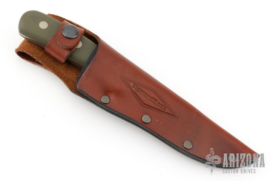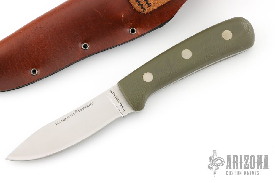 This knife by Diamond Blade features a friction forged D2 blade with .121" blade stock and 1.017, full tang construction. The handle has G10 scales with nickel silver pins. Comes with original box and papers. Has some scratches and patina, otherwise good condition. #0458