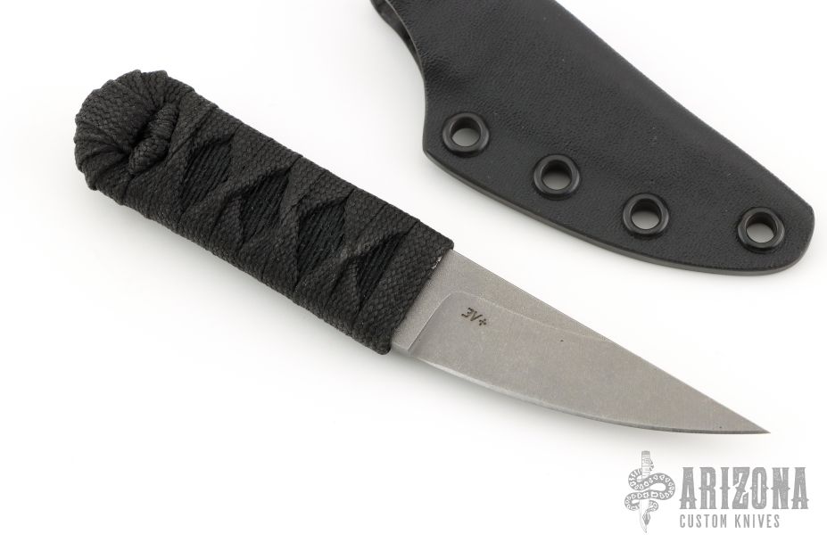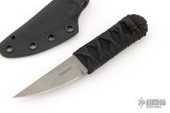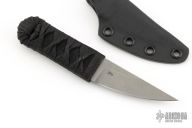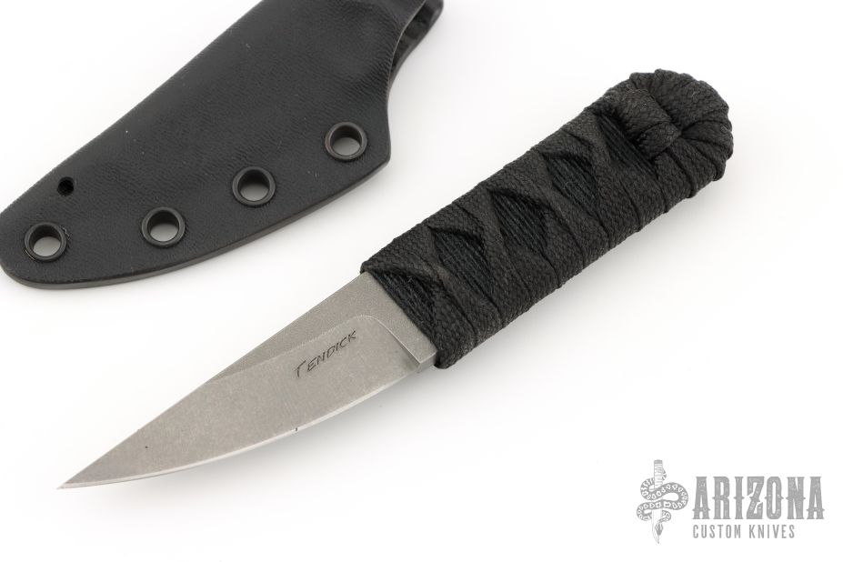 This Micro Aikuchi from Ben Tendick of B.R.T. Bladeworks features a tumbled kwaiken style blade with swedges. .179" Blade stock .858" Blade Depth. The handle has an epoxy soaked tsuka ito wrap over hemp cord under wrap.  Includes kydex sheath.  Includes C.O.A. New from maker.